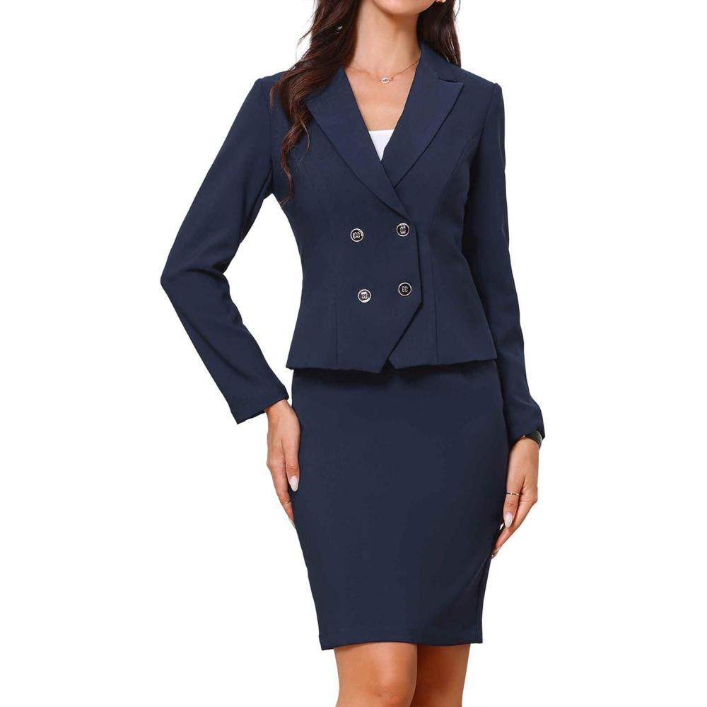 Allegra K 2 Pieces Skirt Suit Sets for Women's Business Notched Lapel Double Breasted Blazer Office Pencil Skirt Outfits(Blue)