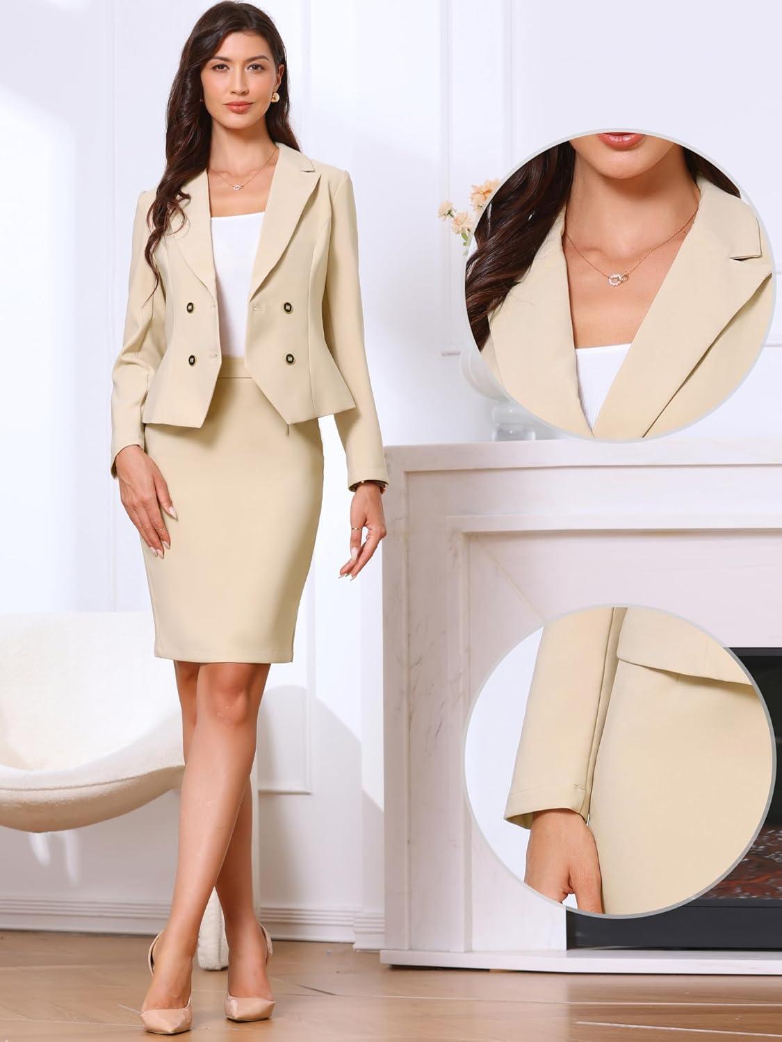 Allegra K 2 Pieces Skirt Suit Sets for Women’s Business Notched Lapel Double Breasted Blazer Office Pencil Skirt Outfits(Khaki)