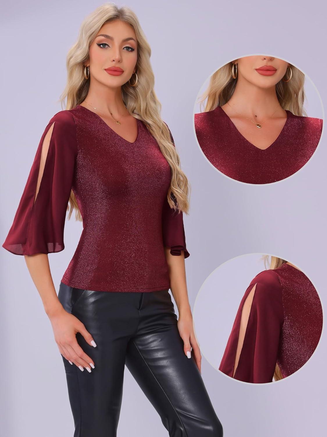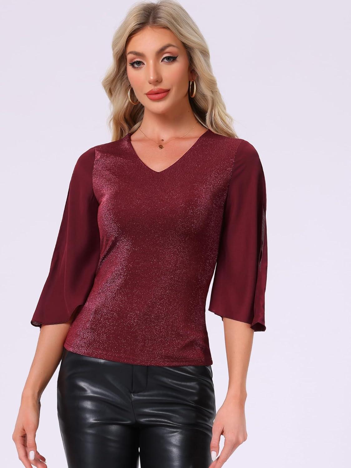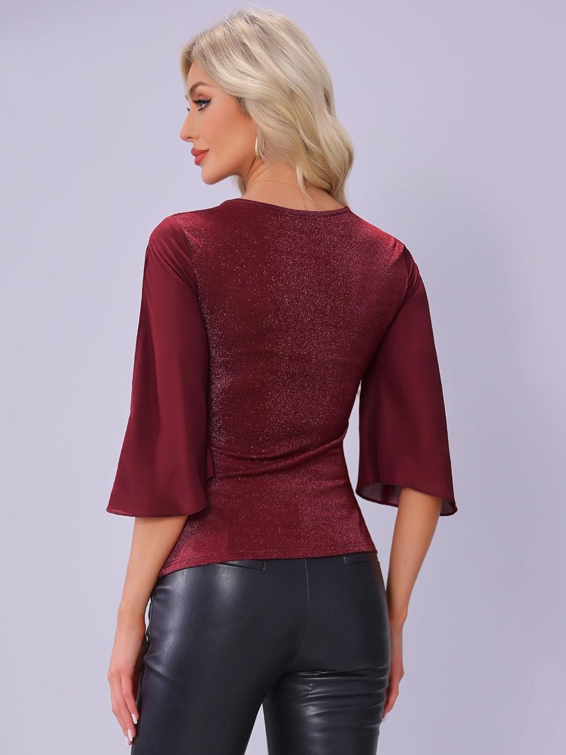 Allegra K 3/4 Sleeve Blouse for Women V Neck Glitter Sparkly Party Club Dressy Tops(Red)