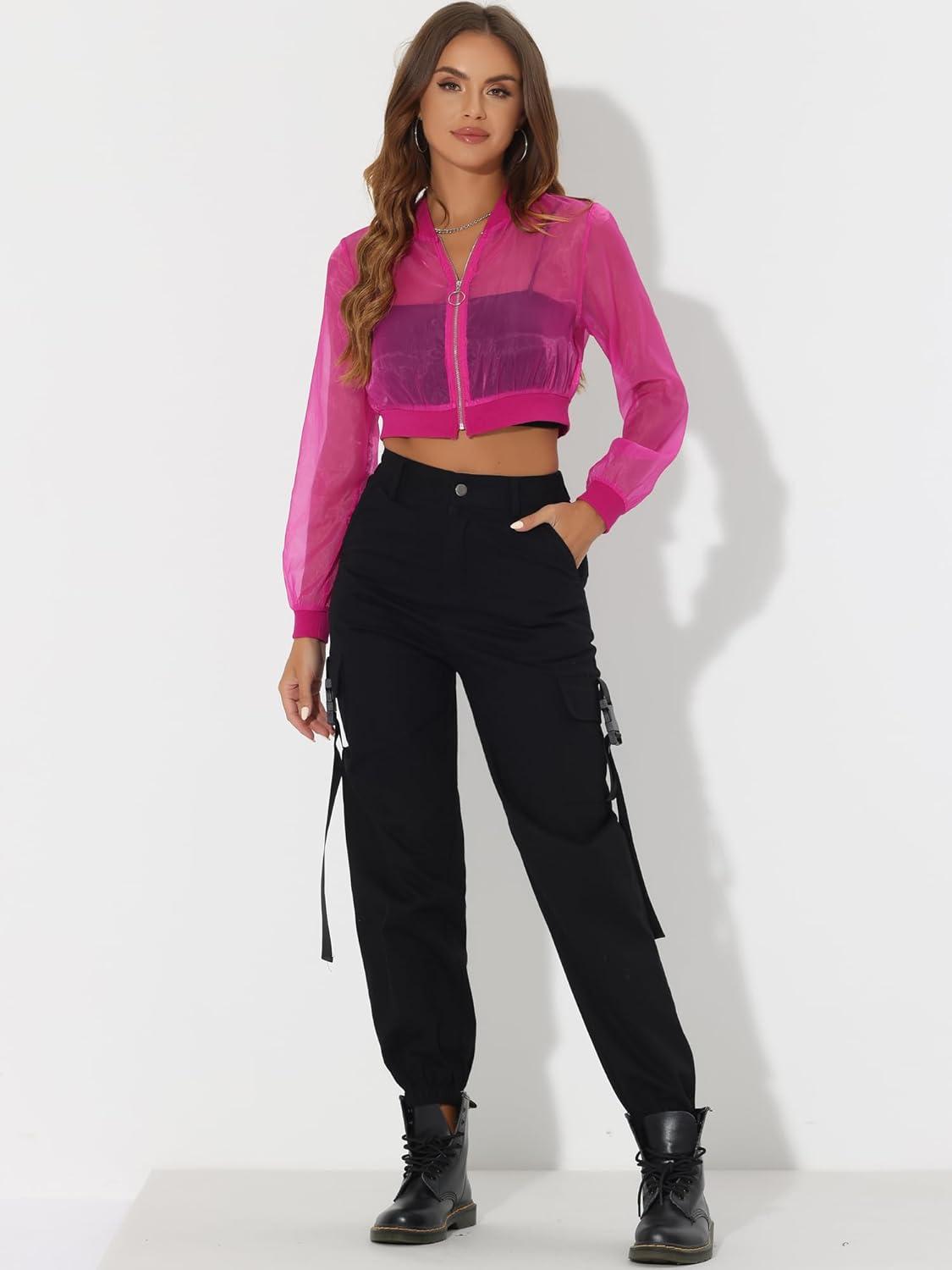 Allegra K Bomber Crop Jacket for Women’s Sheer Mesh Lightweight Long Sleeve Jackets(Hot Pink)