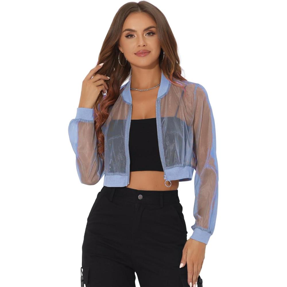 Allegra K Bomber Crop Jacket for Women’s Sheer Mesh Lightweight Long Sleeve Jackets(Light Blue)