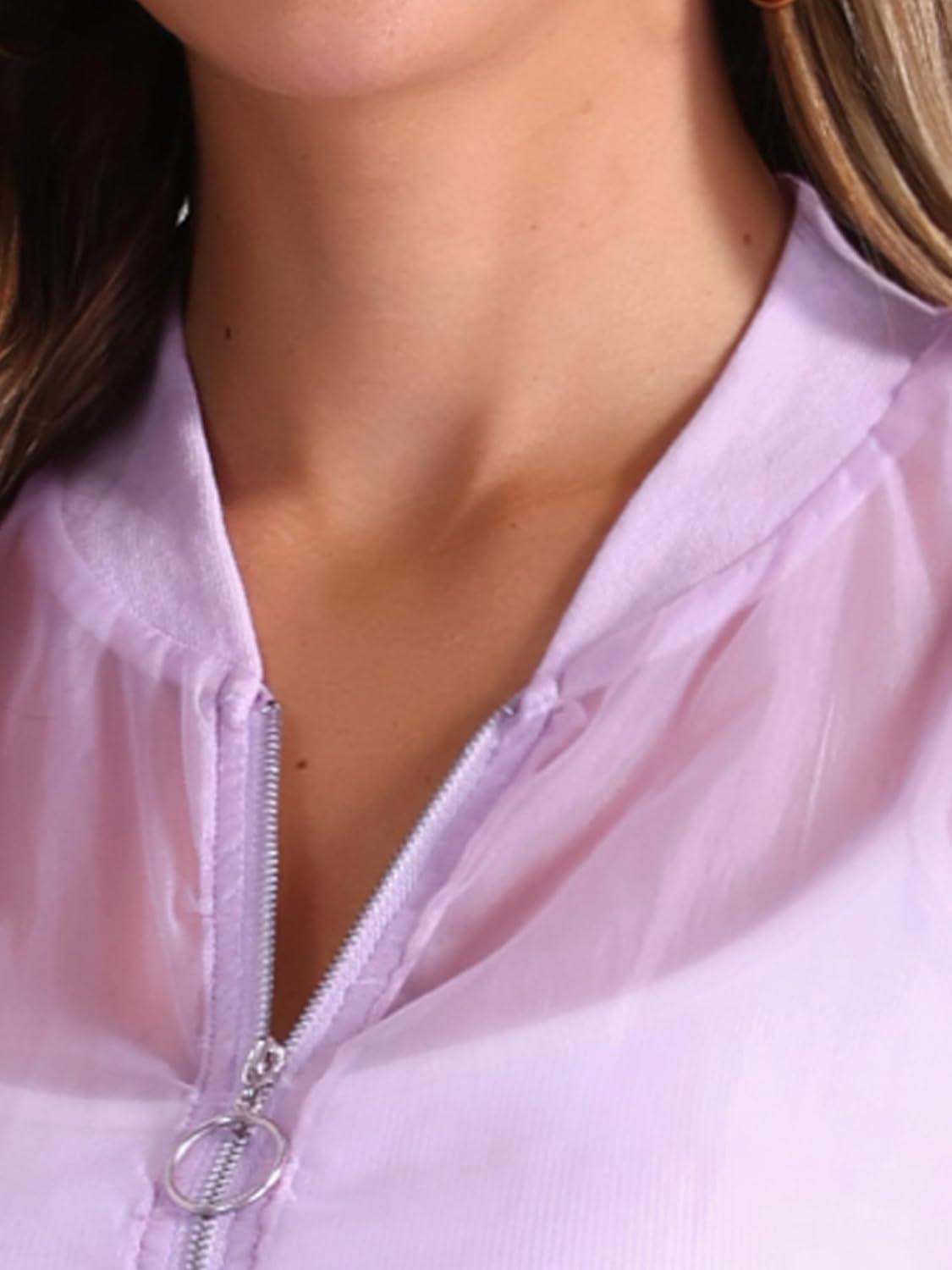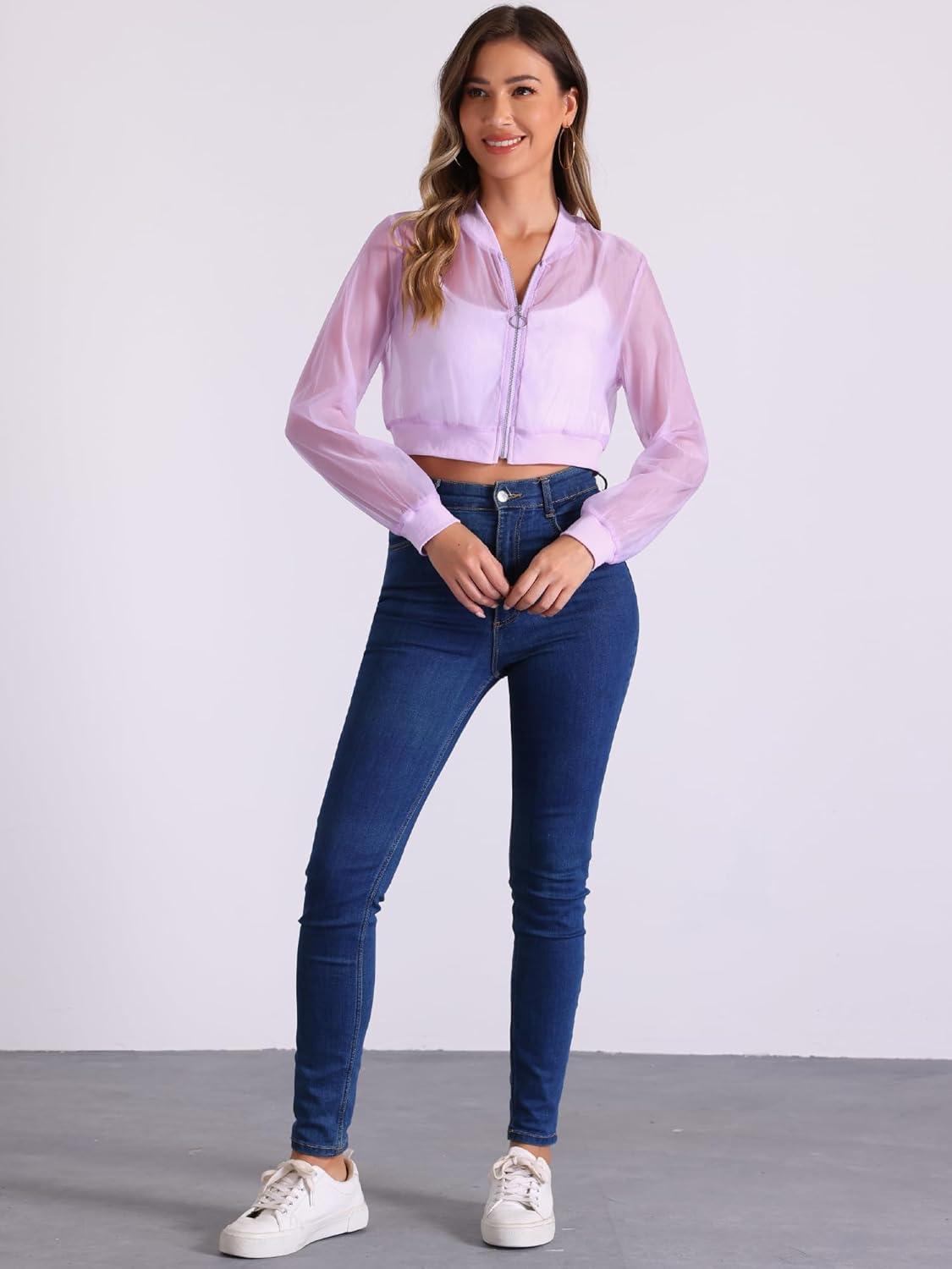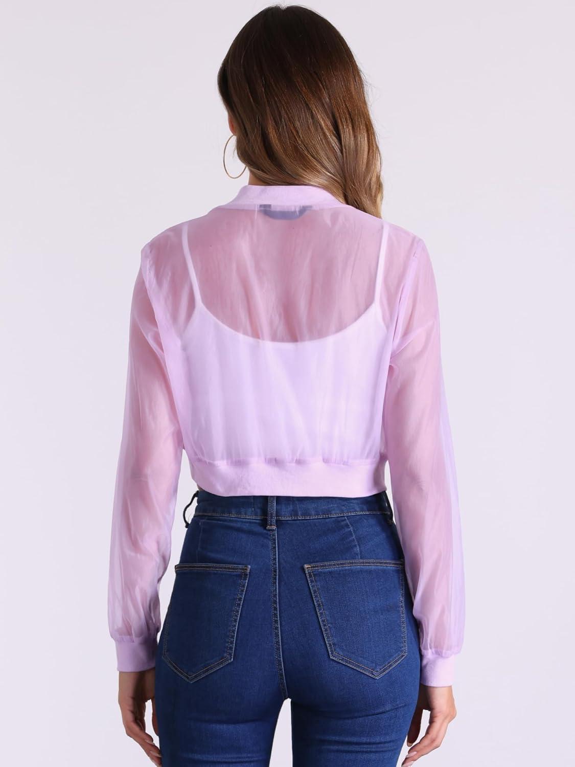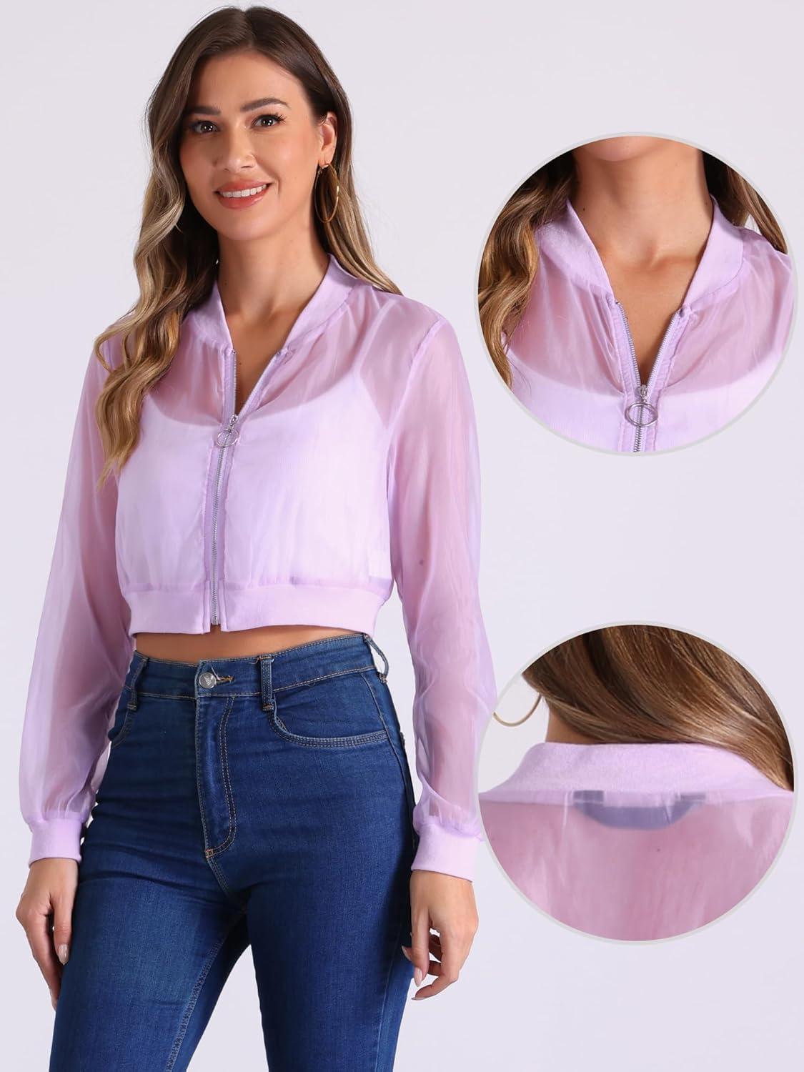 Allegra K Bomber Crop Jacket for Women’s Sheer Mesh Lightweight Long Sleeve Jackets(Light Purple)