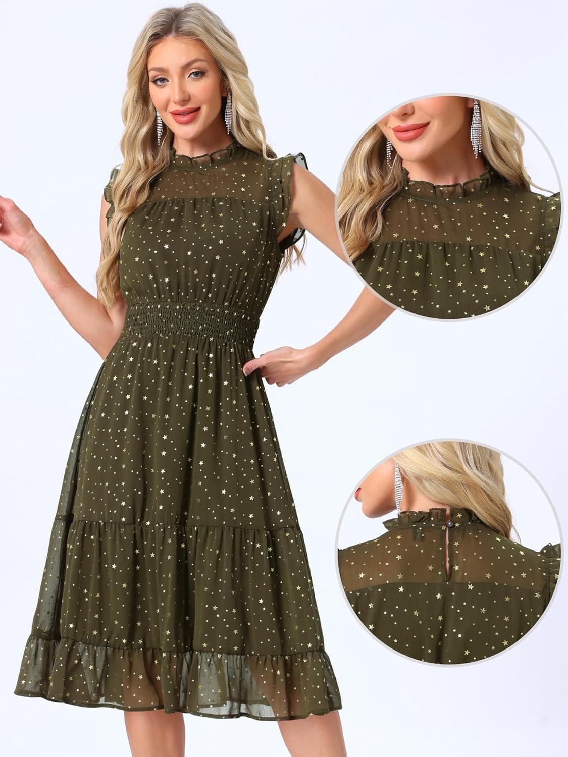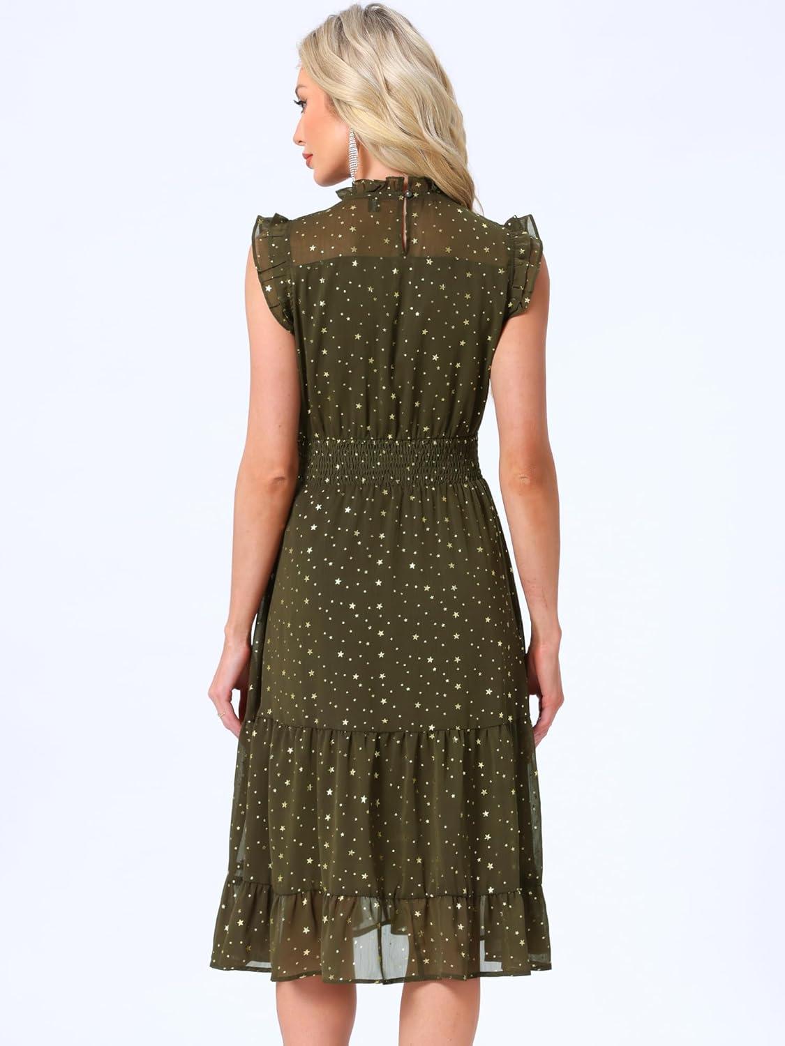 Allegra K Casual Chiffon Midi Dress for Women’s Sleeveless Smocked Waist Gilding Metallic Stars Party Dresses(Army Green)