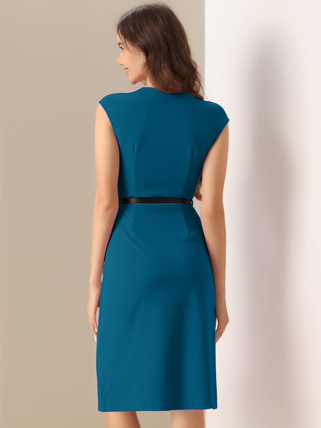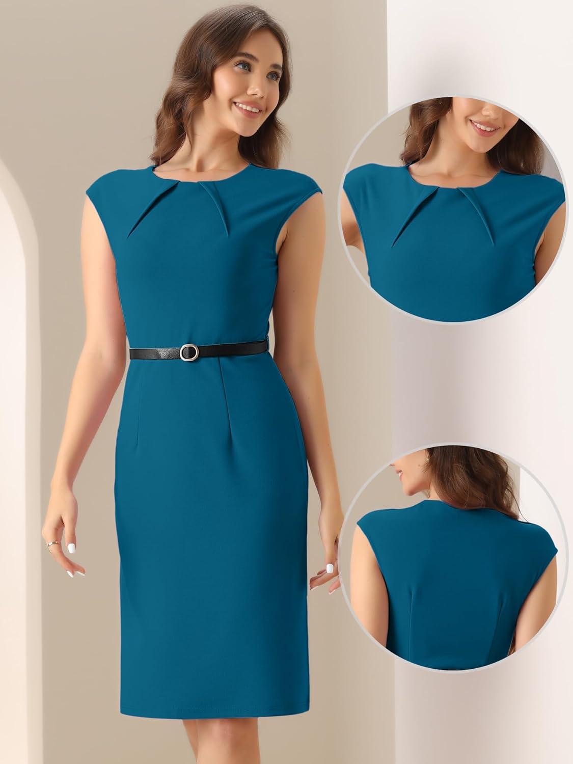 Allegra K Elegant Business Dress for Women’s Cap Sleeve Belted Wear to Work Sheath Dresses(Lake Blue)