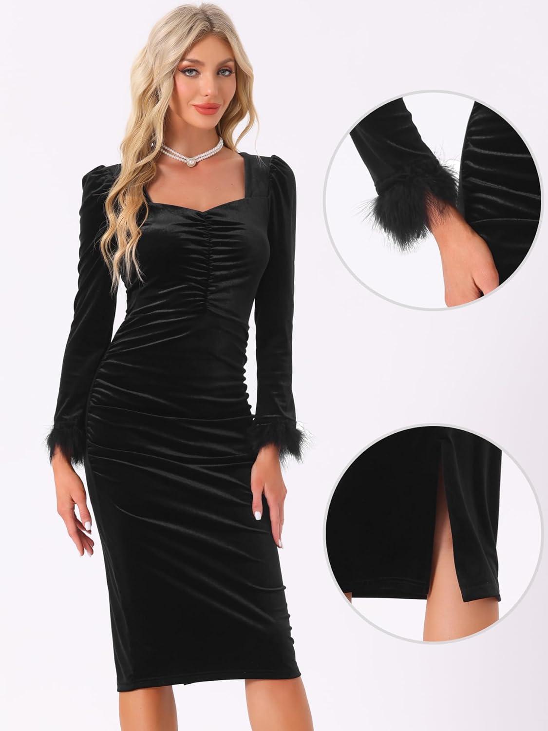 Allegra K Fall Velvet Long Sleeve Dress for Women’s Feather Sleeve Square Neck Cocktail Party Sexy Bodycon Dresses(Black)