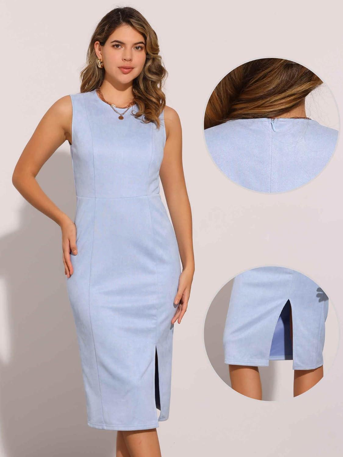 Allegra K Faux Suede Dresses for Women’s Sleeveless Crewneck Split Hem Work Office Sheath Dress(Light Blue)