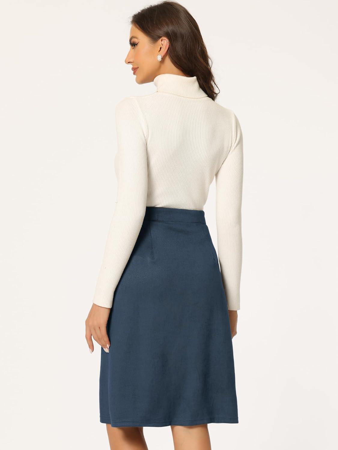 Allegra K Faux Suede Skirt for Women's Button Front High Waist 2025 Fall Knee Length A-Line Skirts(Dark Blue)