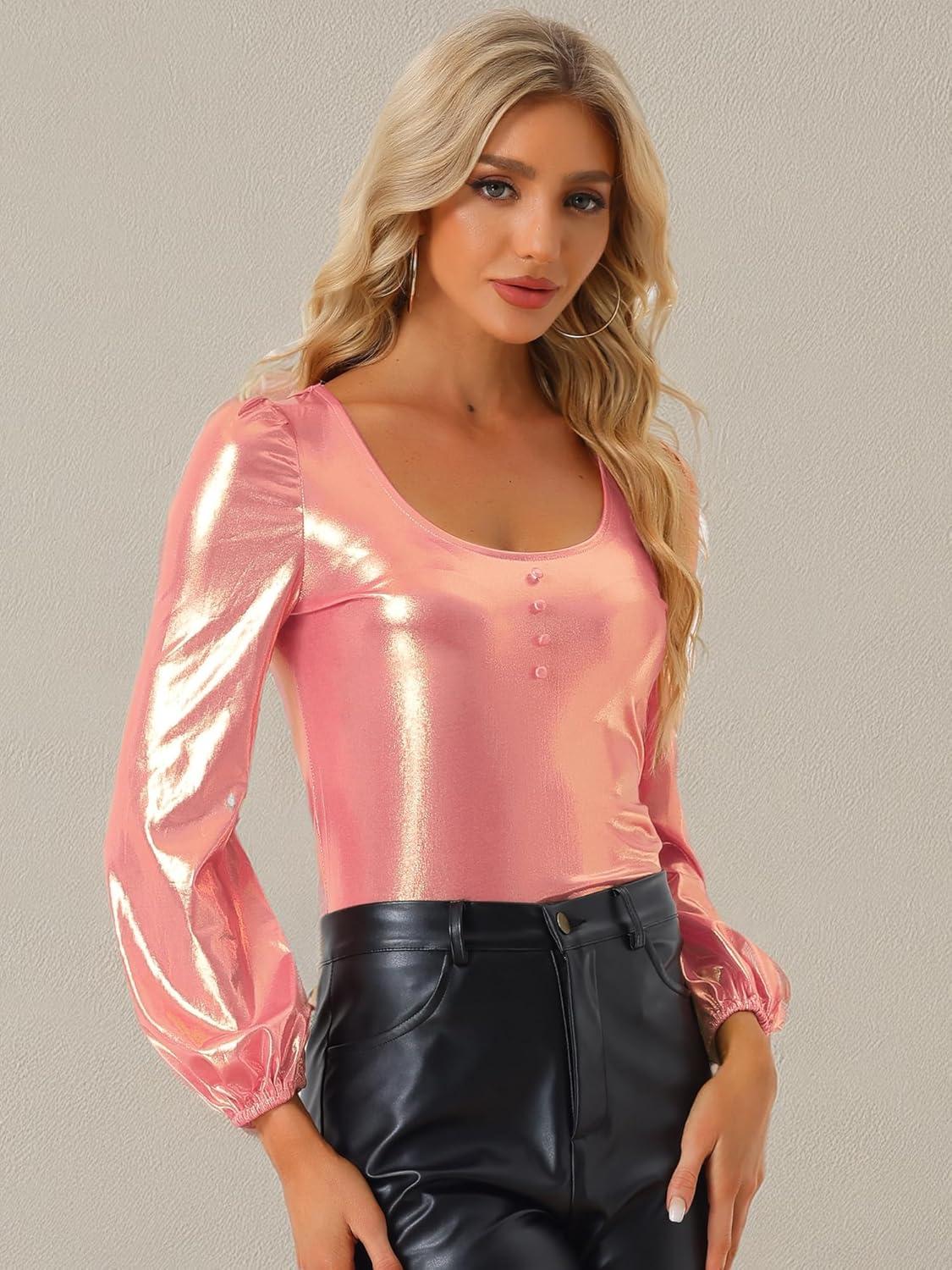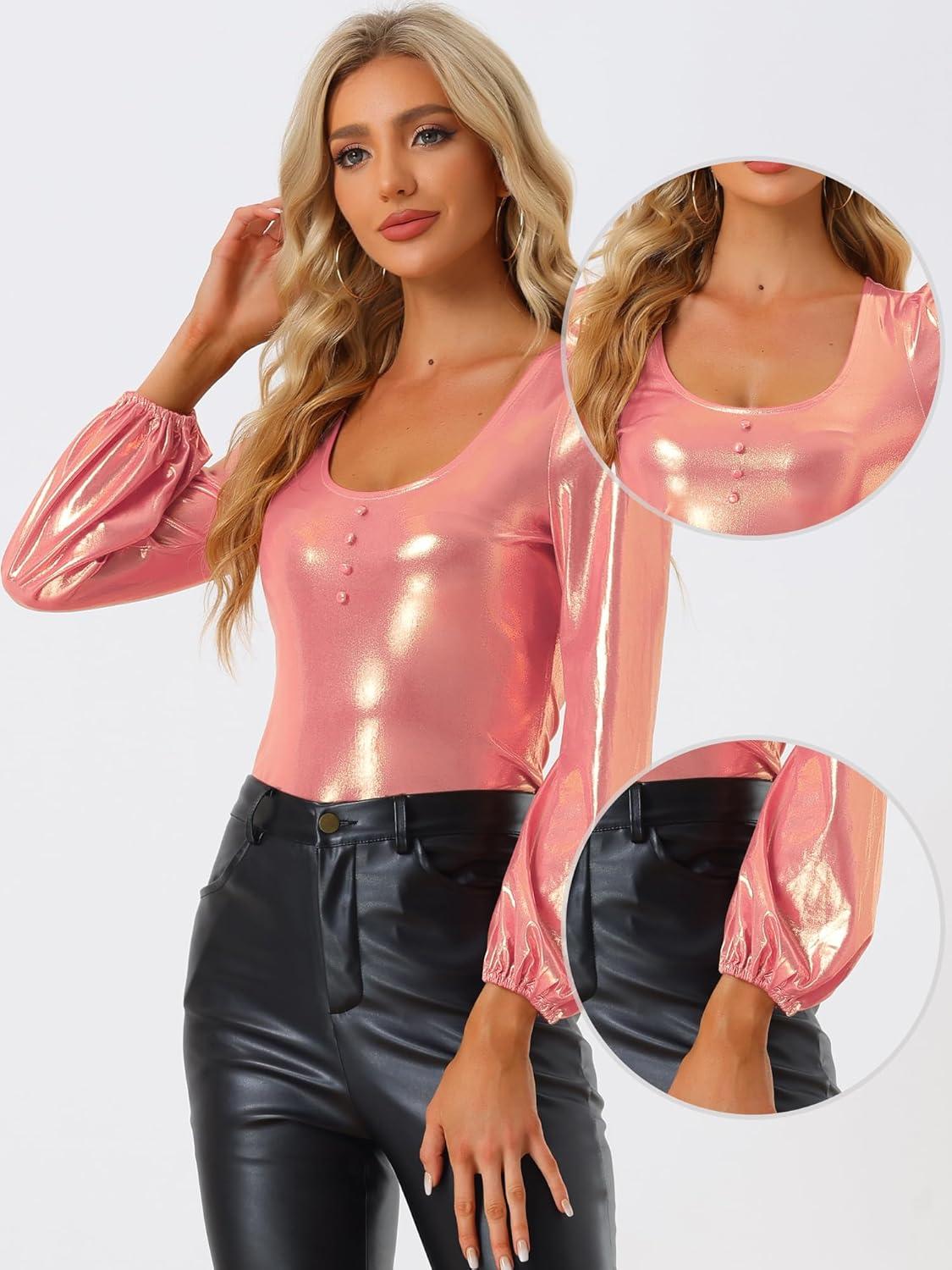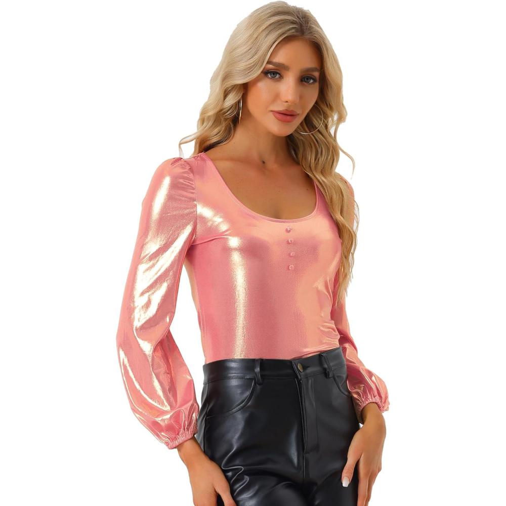 imageAllegra K Halloween Metallic Blouse for Womens Sparkly Party Shiny Bishop Sleeve Glitter TopsRose Gold