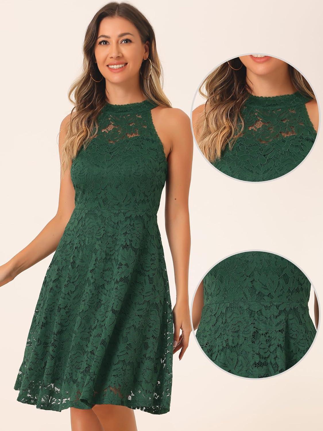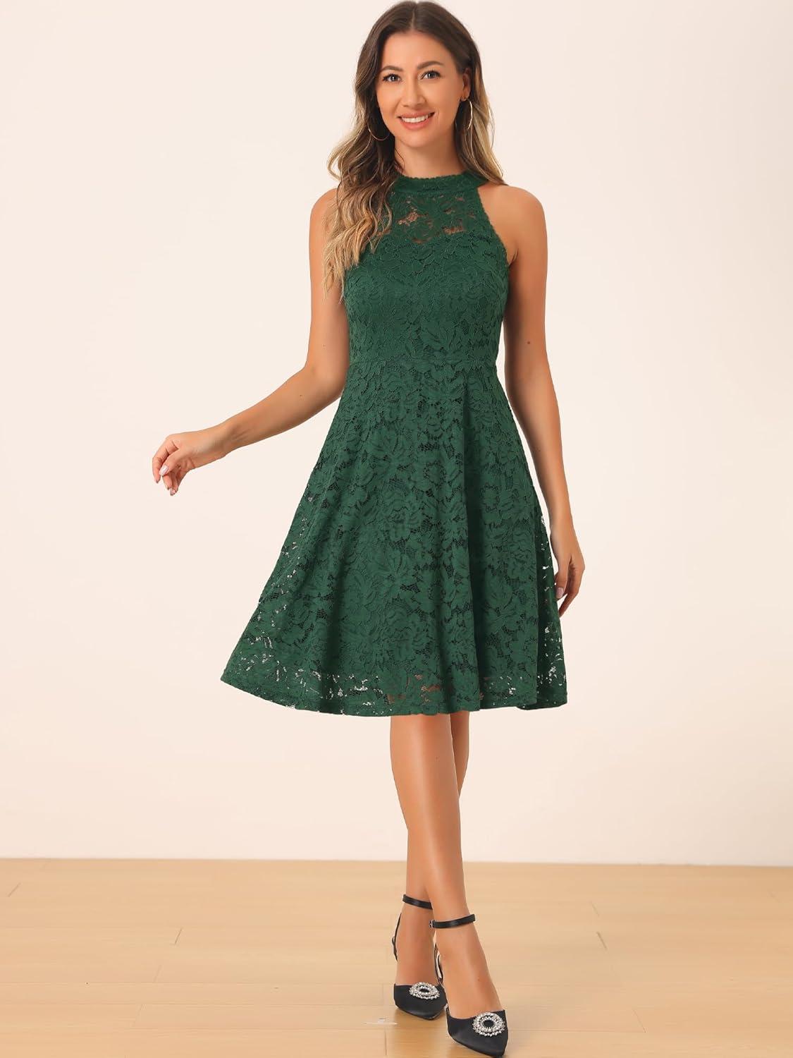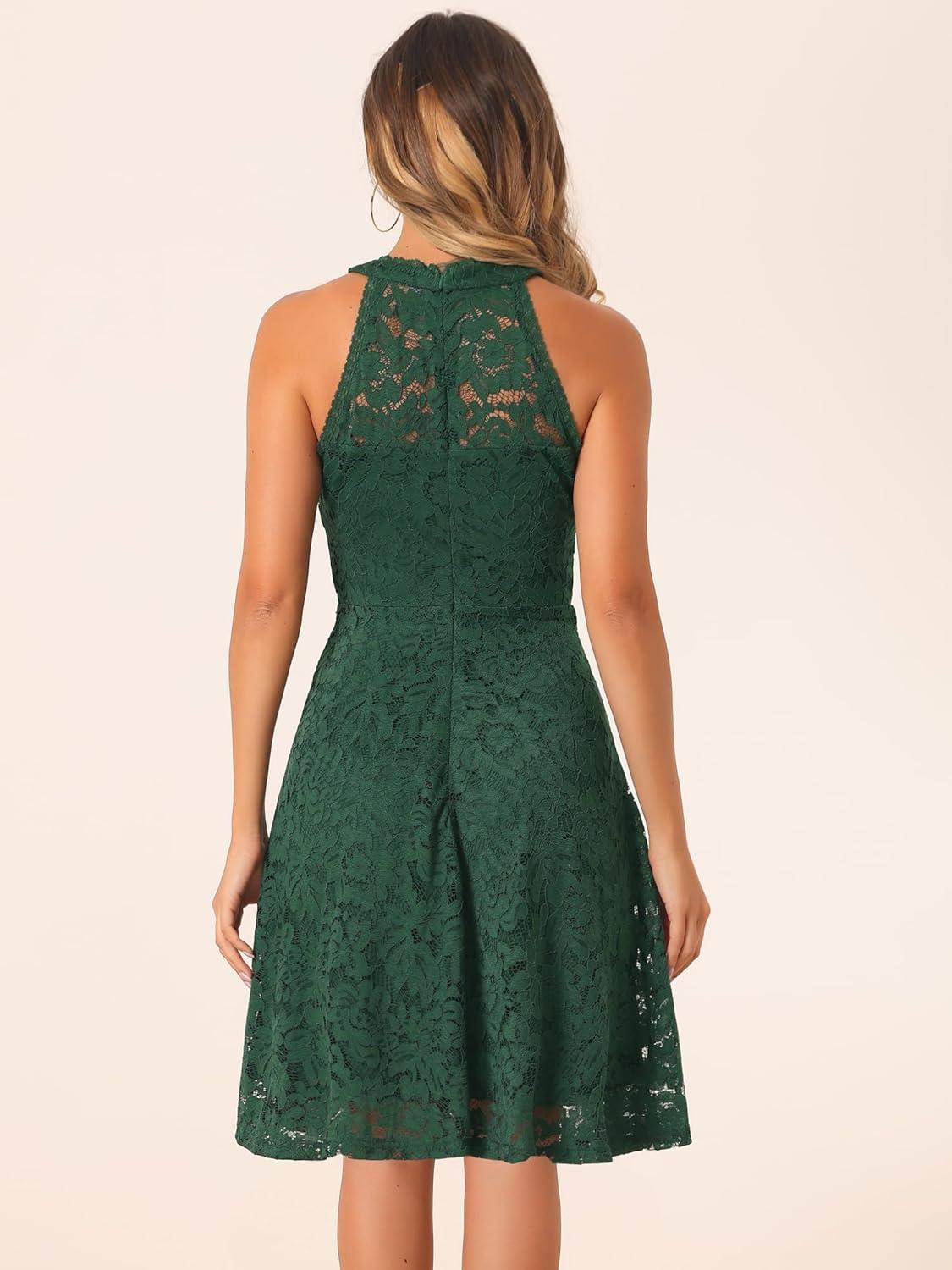 Allegra K Lace Cocktail Dress for Women’s Elegant Halter Wedding Guest Bridesmaid Party Dress(Dark Green)