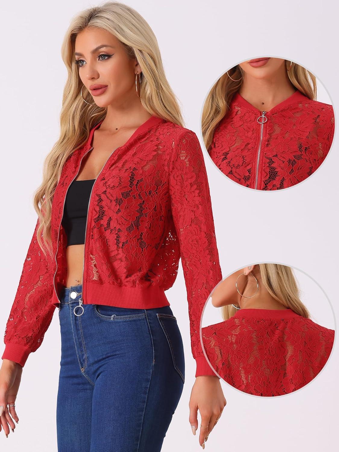 Allegra K Lace Jackets for Women’s Stand Collar Zip Up Lightweight Gothic Sheer Baseball Jacket(Red)