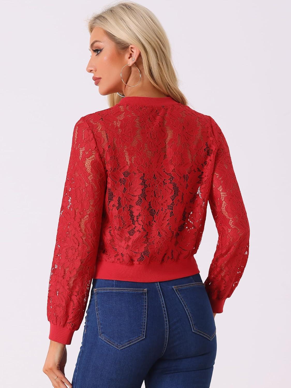Allegra K Lace Jackets for Women's Stand Collar Zip Up Lightweight Gothic Sheer Baseball Jacket(Red)