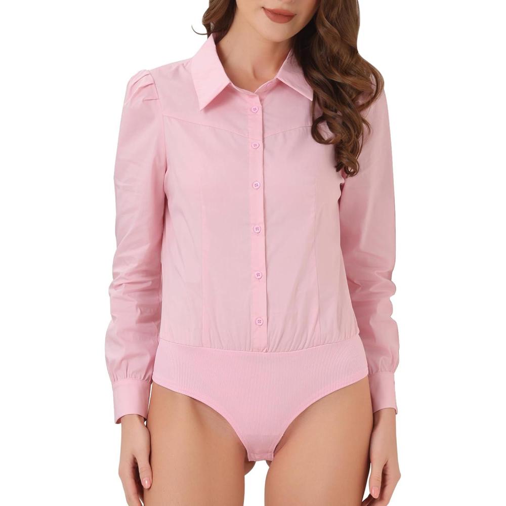 Allegra K Leotard Shirt for Women’s Collared Business Casual Button Down Long Sleeves Bodysuit Top(Pink)