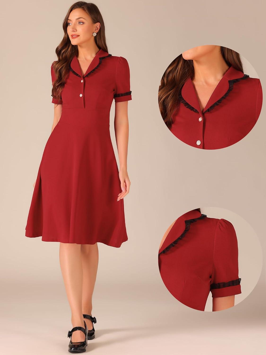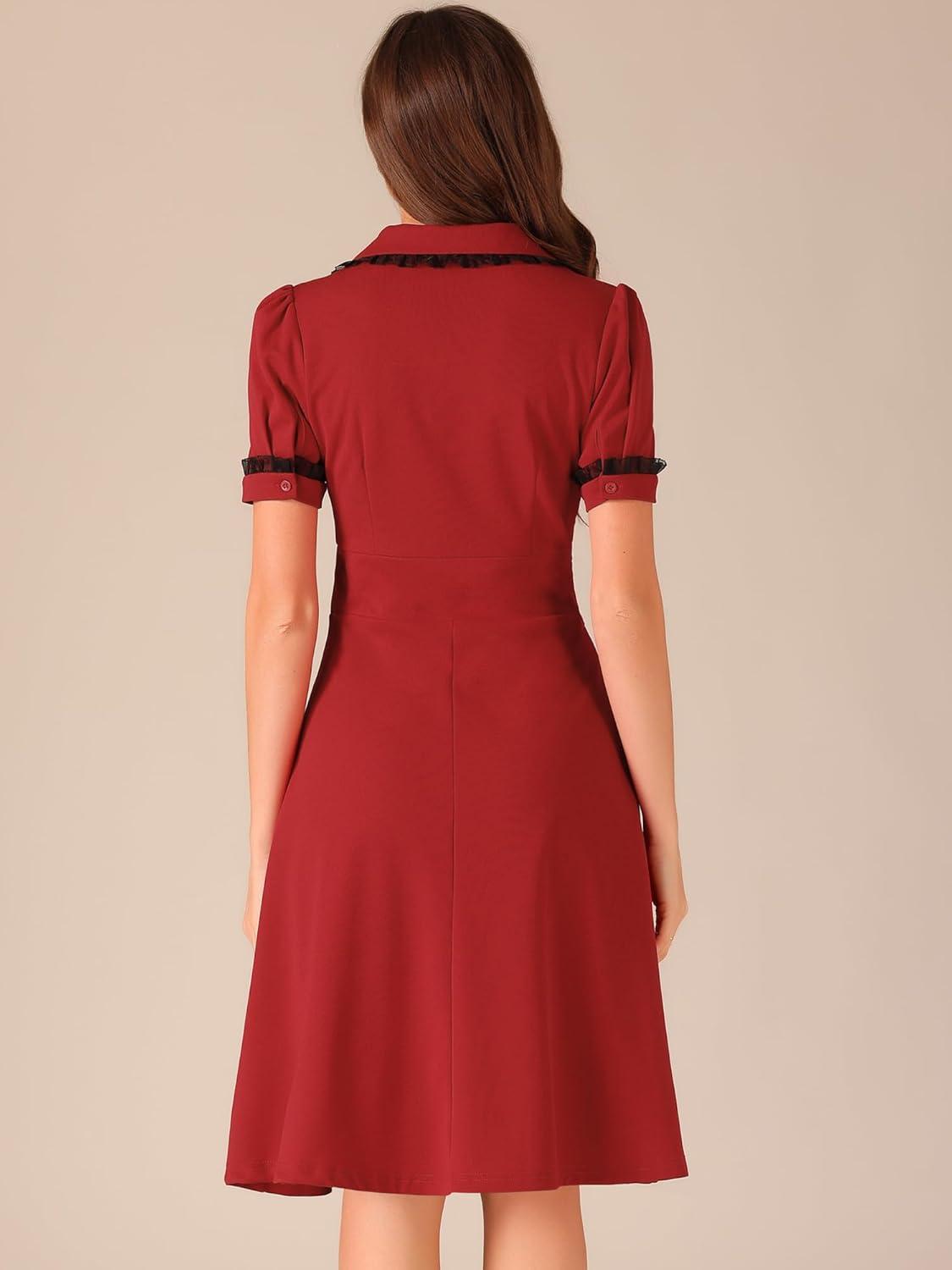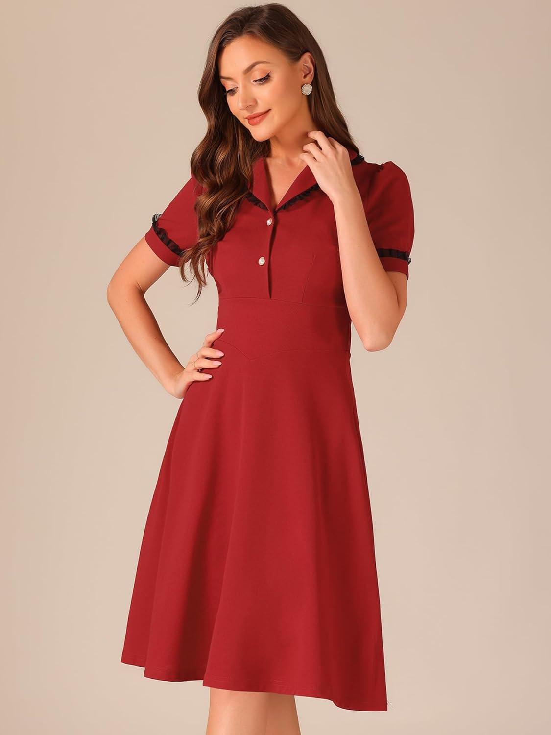 Allegra K Peter Pan Collar Dress for Women’s Work Puff Sleeve Vintage Dresses(Red)