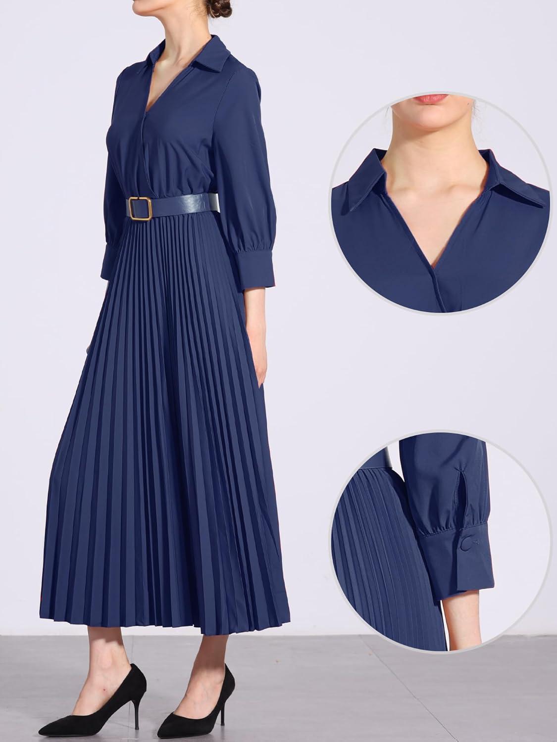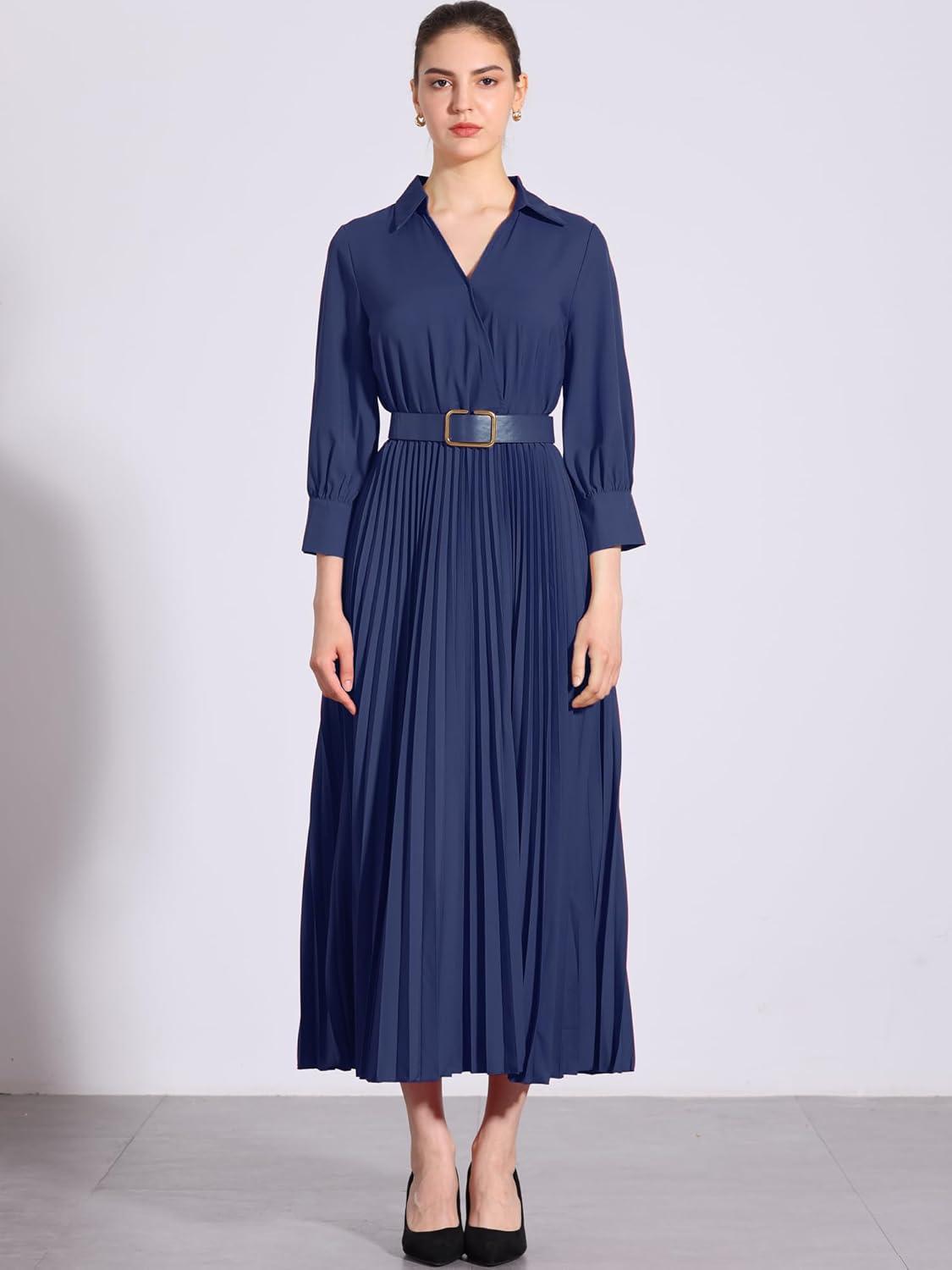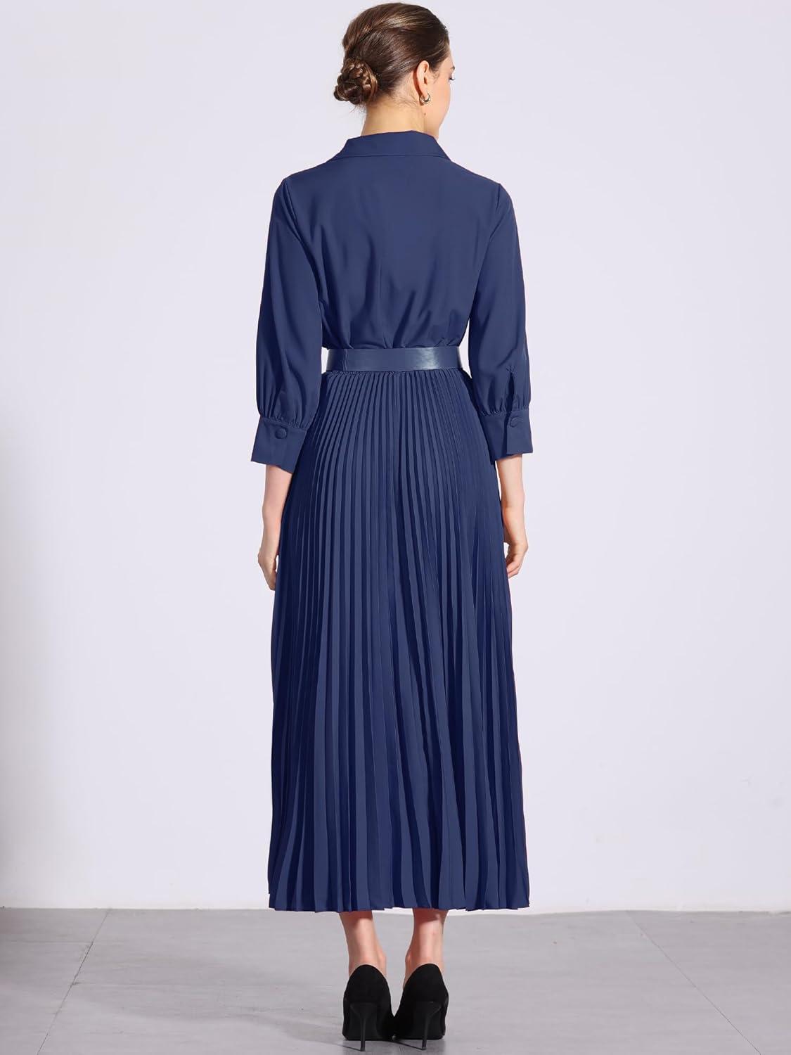 Allegra K Semi Formal Pleated Dress for Women’s 3/4 Sleeves Empire Waist Wedding Guest Maxi Dress with Belt(Dark Blue)