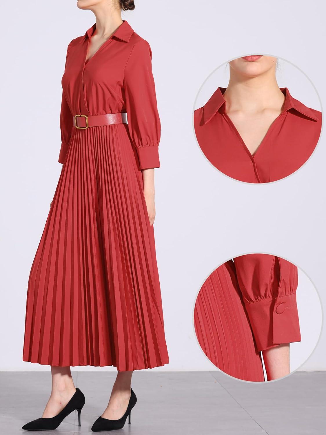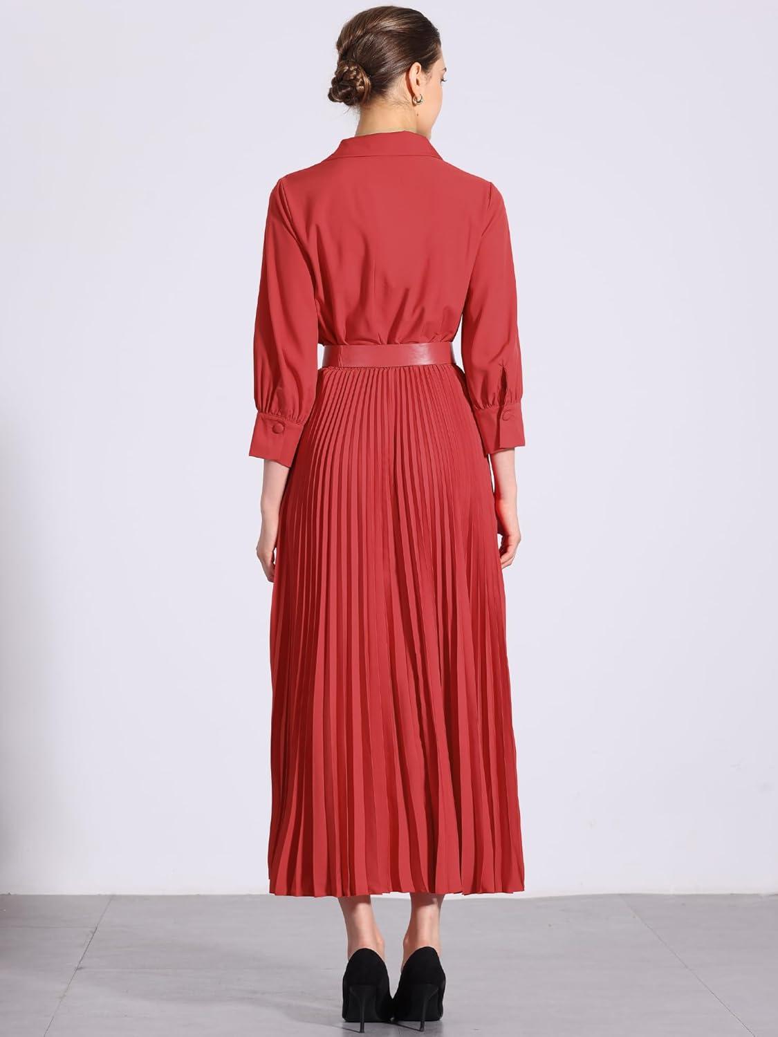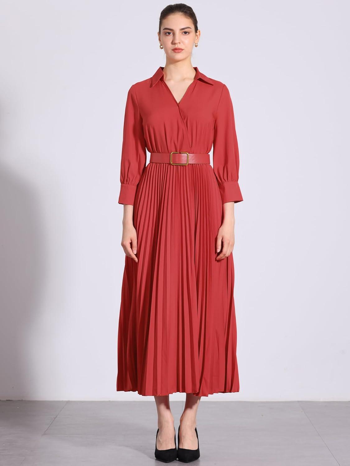 Allegra K Semi Formal Pleated Dress for Women's 3/4 Sleeves Empire Waist Wedding Guest Maxi Dress with Belt(Red)
