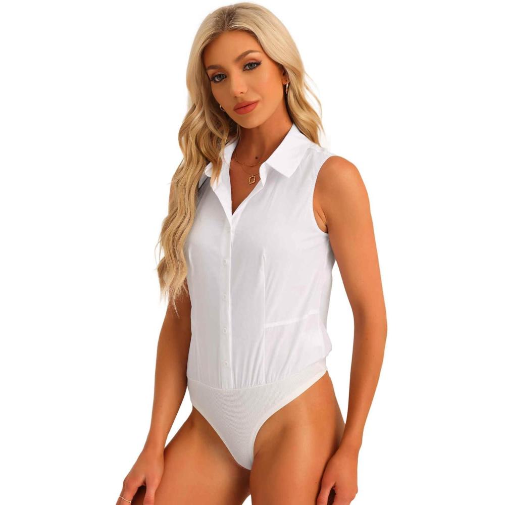 imageAllegra K Sleeveless Bodysuit Tops for Womens Business Work Button Down Leotard ShirtWhite