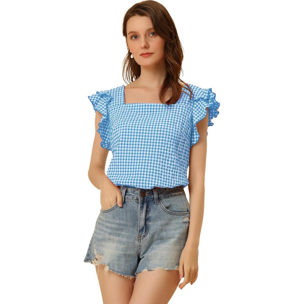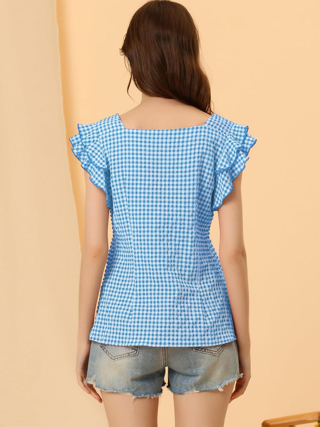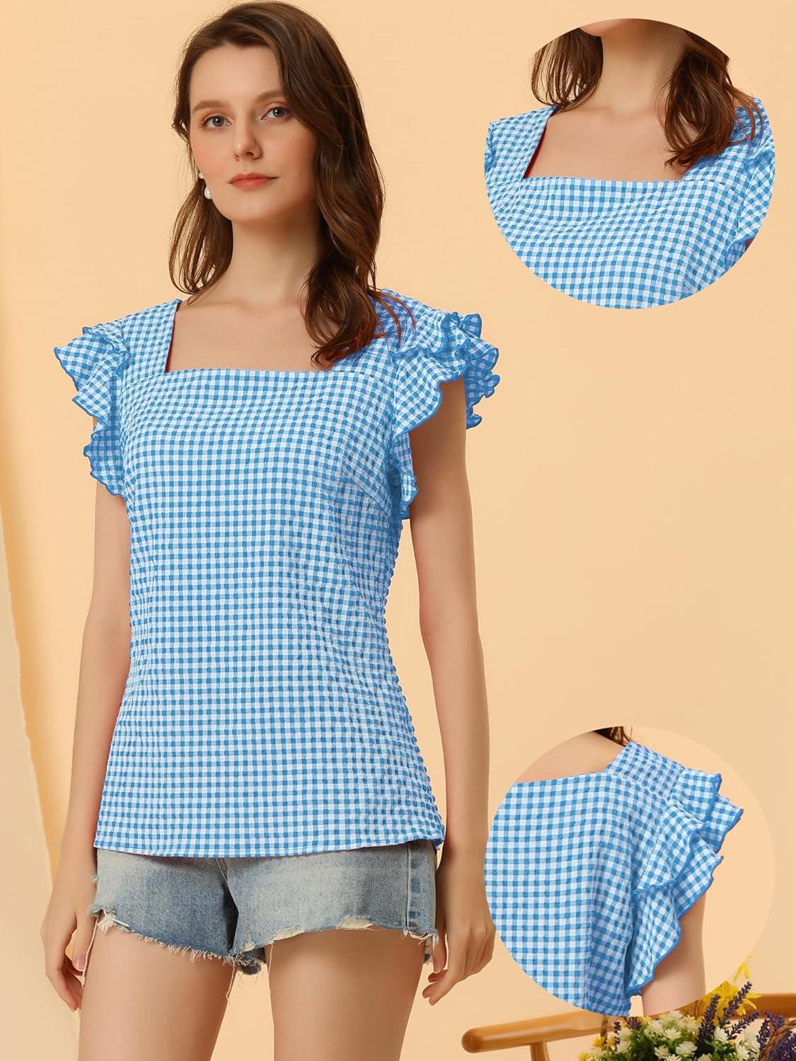 Allegra K Summer Gingham Tops for Women’s Square Neck Ruffle Cap Sleeve Blouses(Lake Blue)
