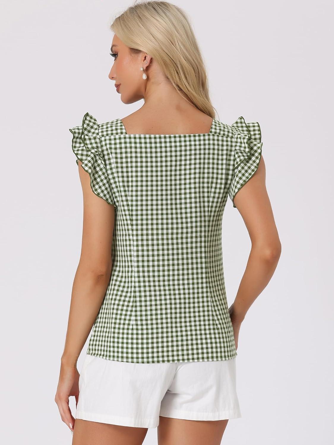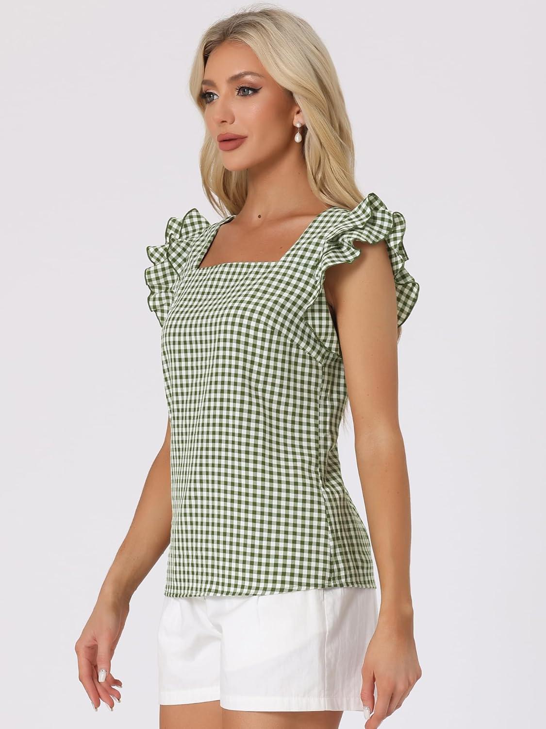 Allegra K Summer Gingham Tops for Women’s Square Neck Ruffle Cap Sleeve Blouses(Green)