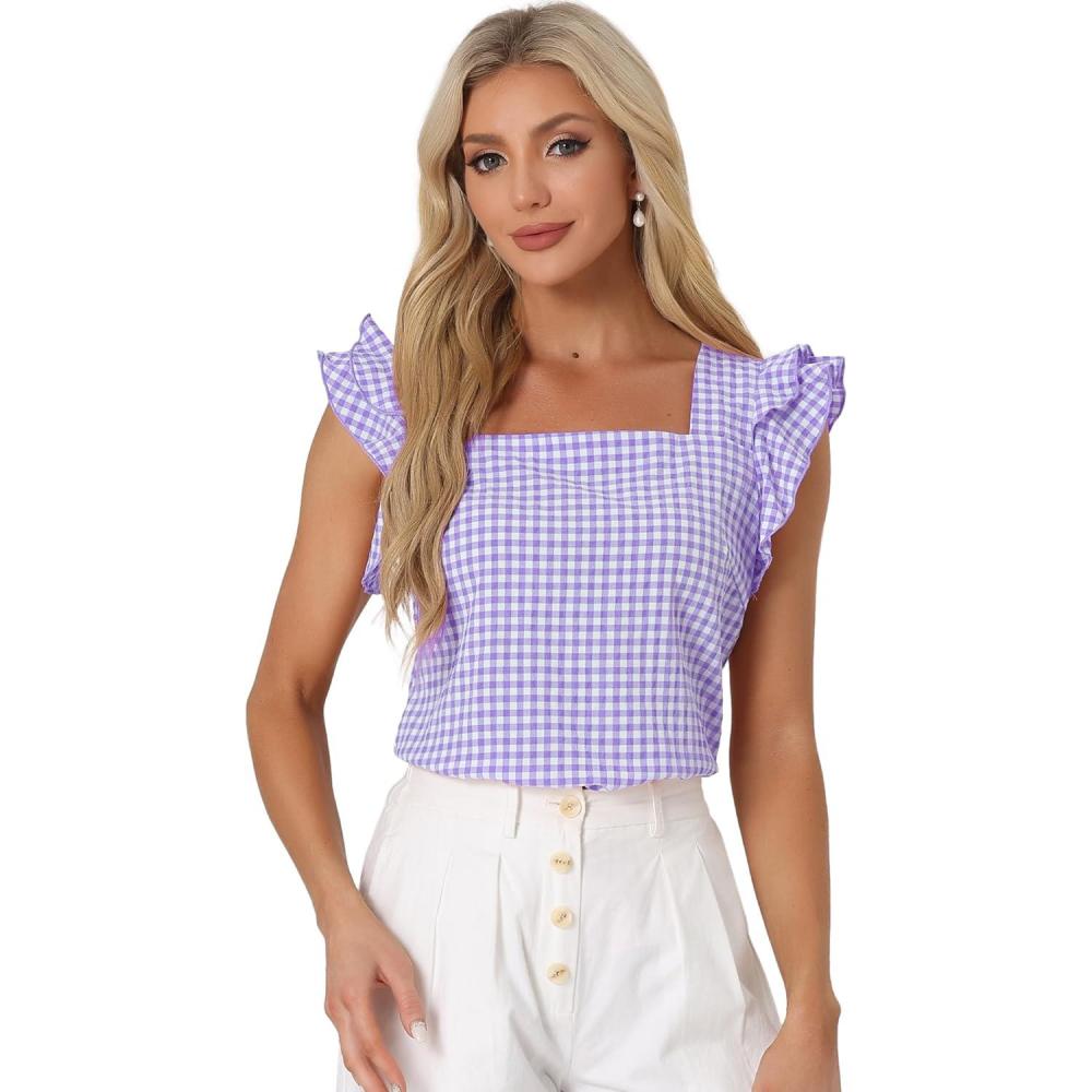 Allegra K Summer Gingham Tops for Women’s Square Neck Ruffle Cap Sleeve Blouses(Purple)
