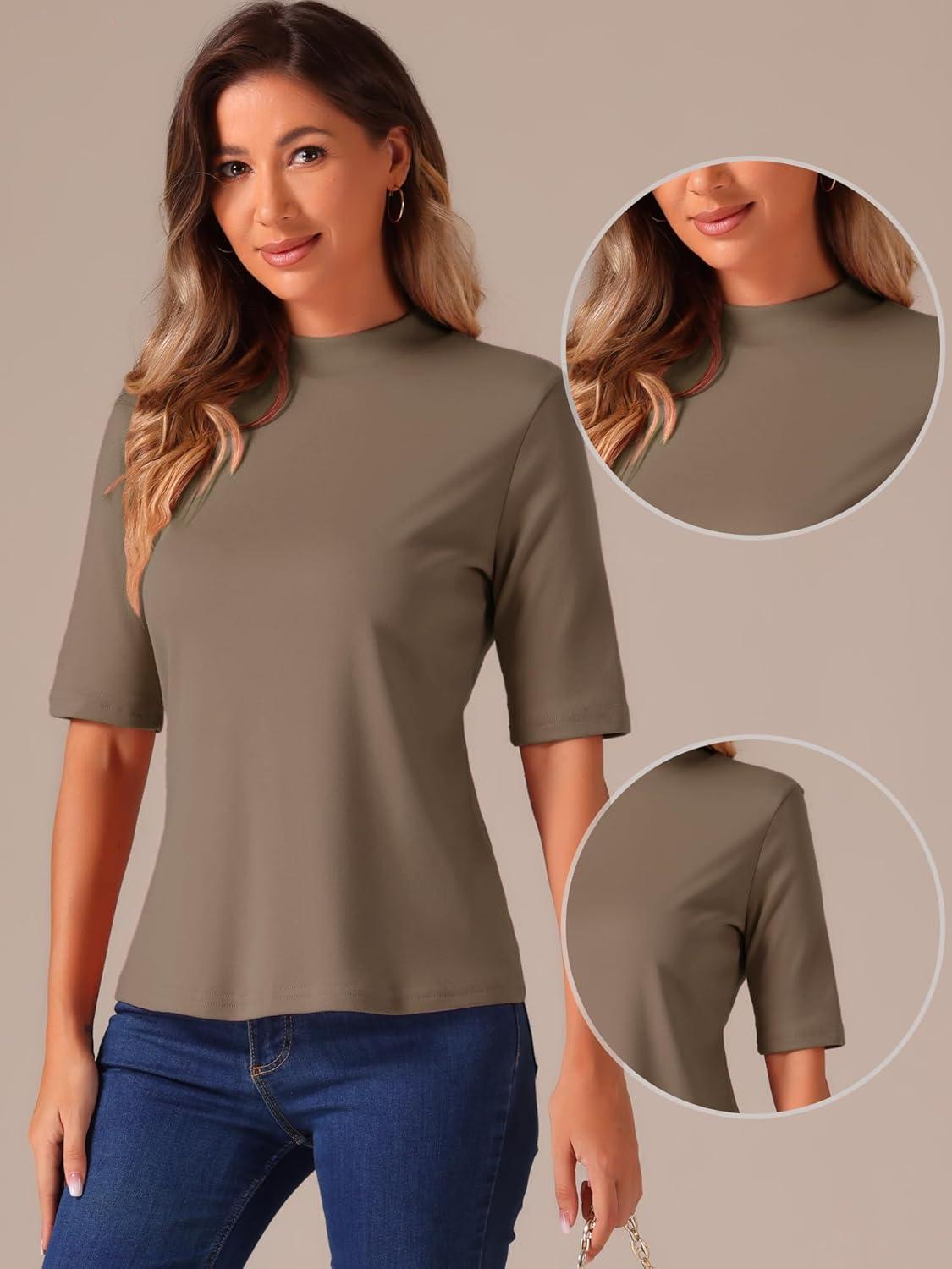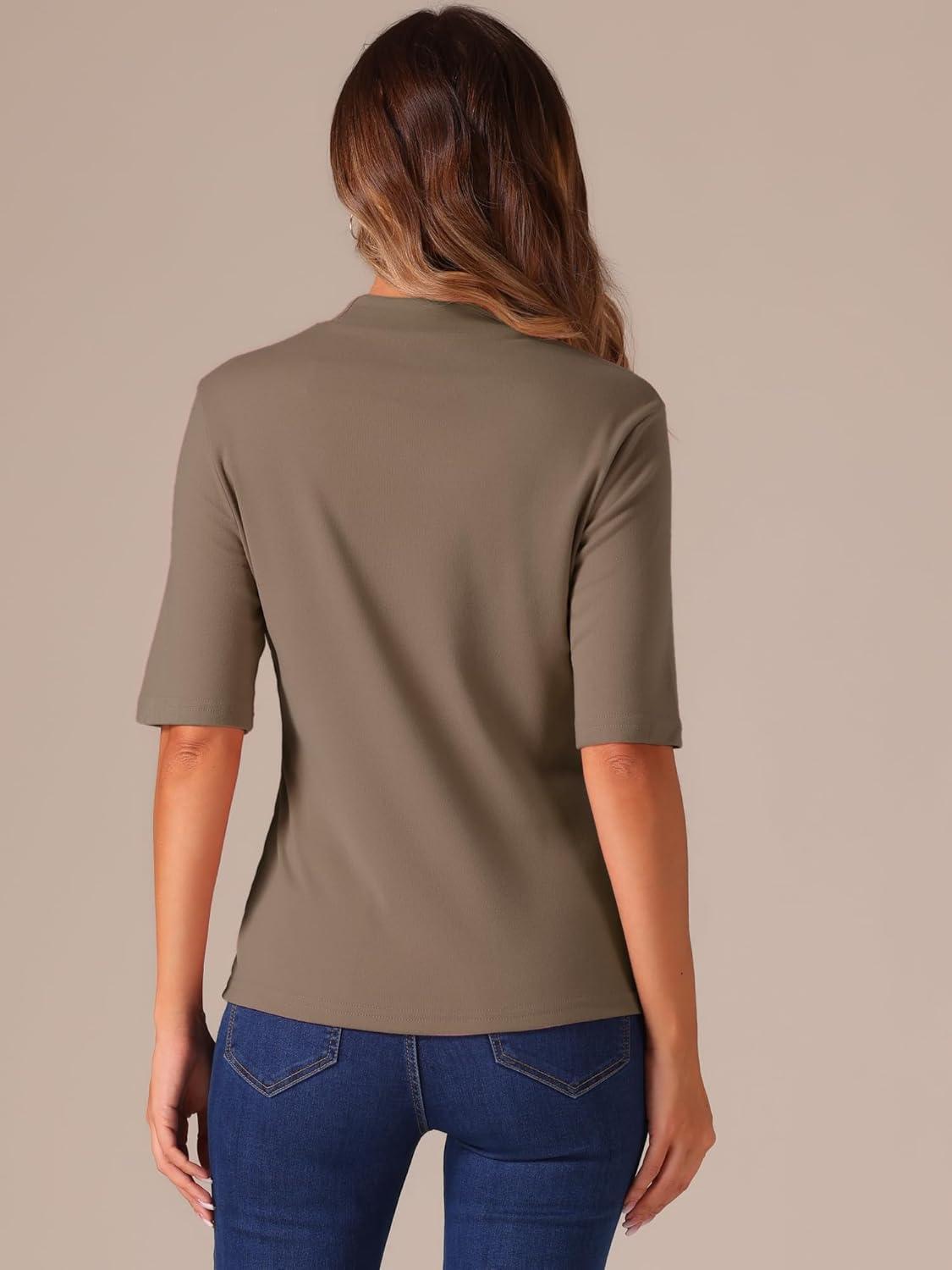 imageAllegra K Tops for Women Trendy Half Sleeve Mock Neck Casual Top 2025 Fall Slim Fit TShirtsCamel