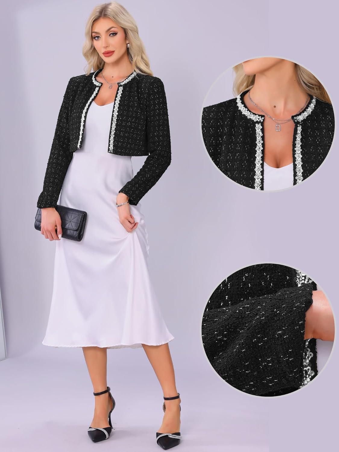 Allegra K Tweed Cropped Jackets for Women's Long Sleeve Open Front Elegant Work Office Short Jacket(Black)
