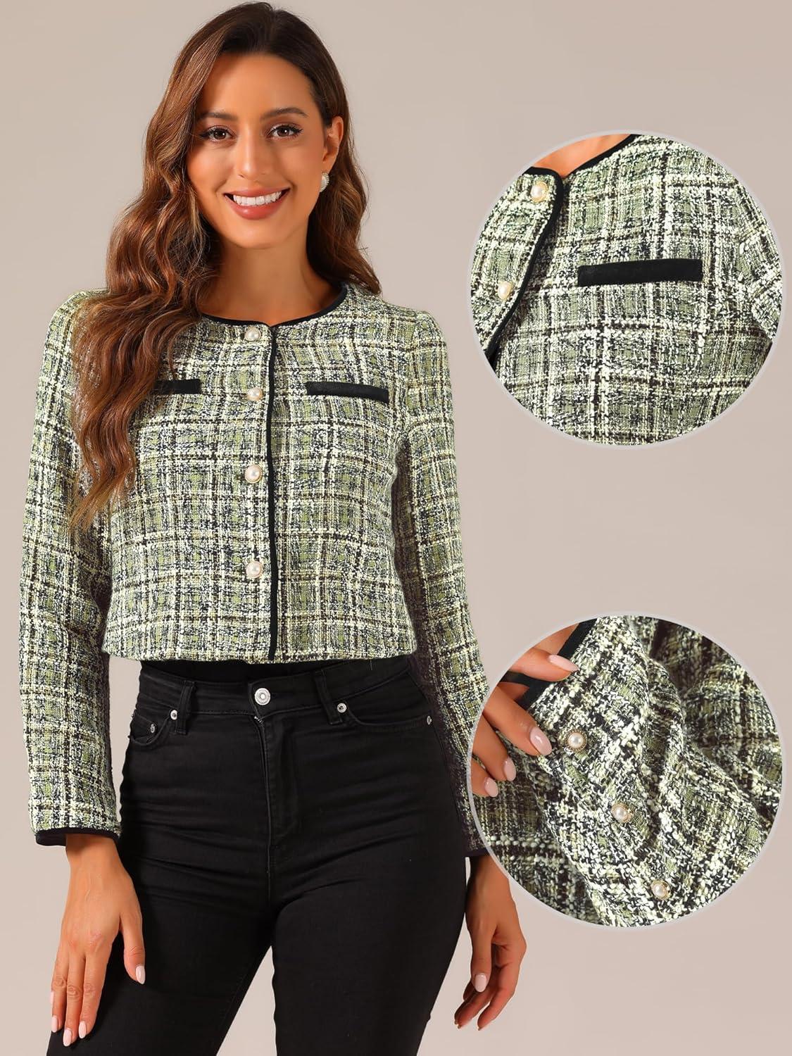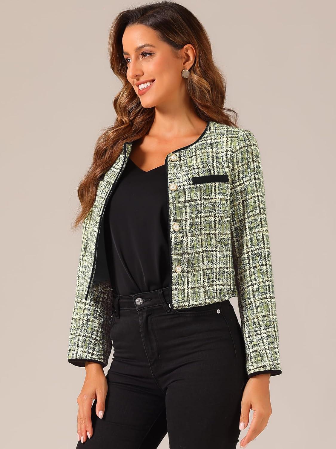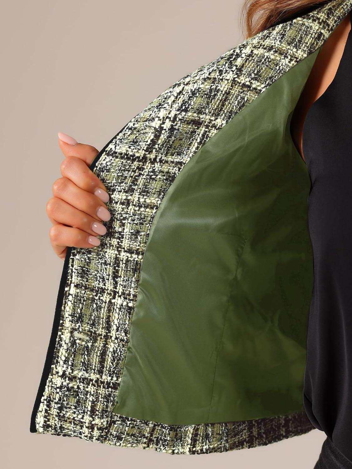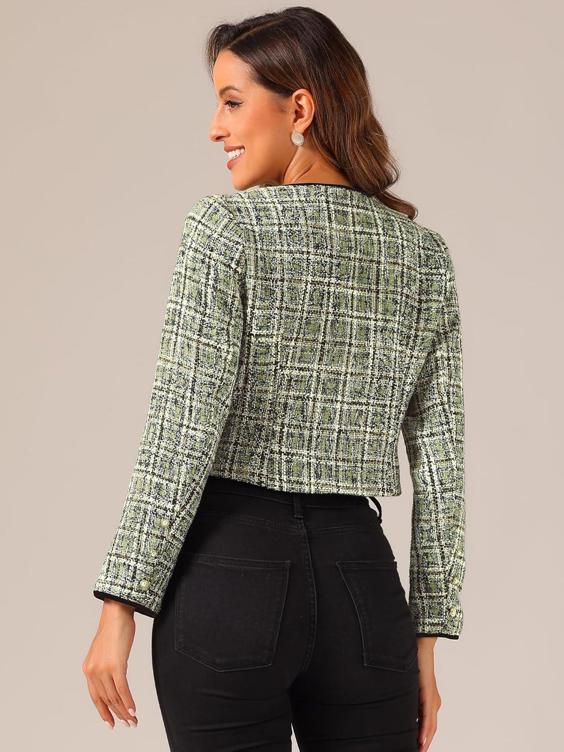 Allegra K Tweed Jacket for Women’s Long Sleeve Casual Work Office Plaid Short Outwear(Green)