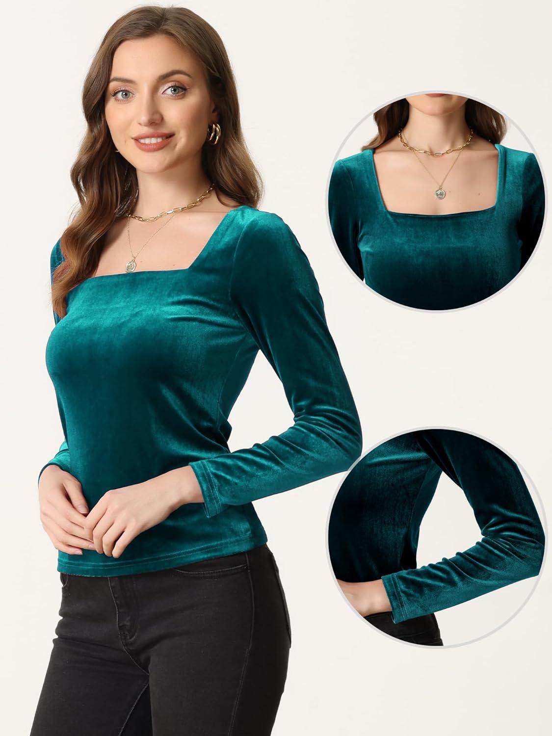 Allegra K Velvet Top for Women’s Square Neck Long Sleeves Solid Casual T-Shirt Blouse(Dark Green)