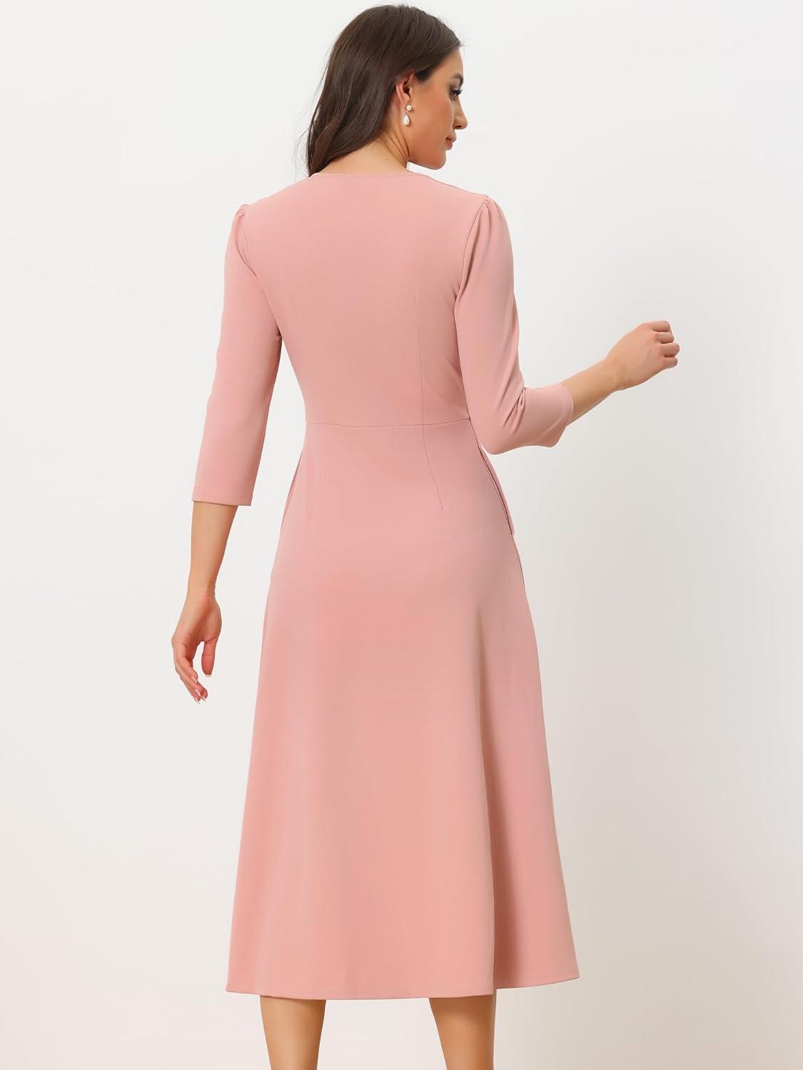 Allegra K Women’s 3/4 Sleeve Dresses V Neck Elegant A-Line Work Business Formal Midi Dress with Pockets(Pink)