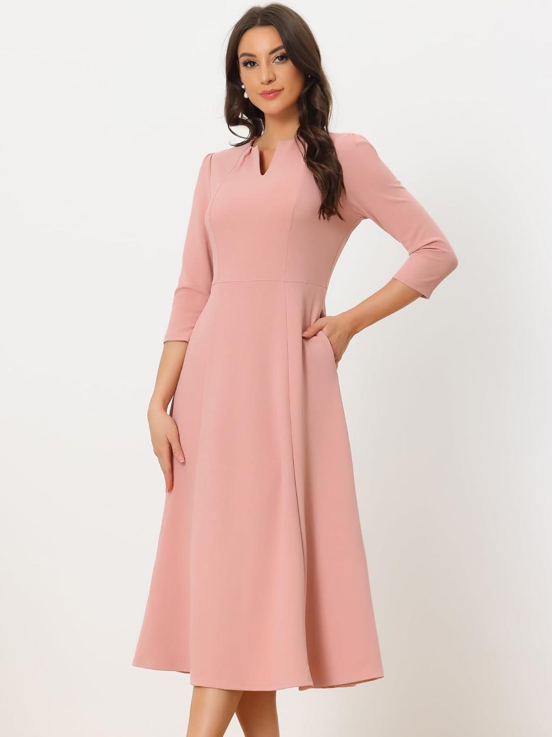 imageAllegra K Womens 34 Sleeve Dresses V Neck Elegant ALine Work Business Formal Midi Dress with PocketsPink