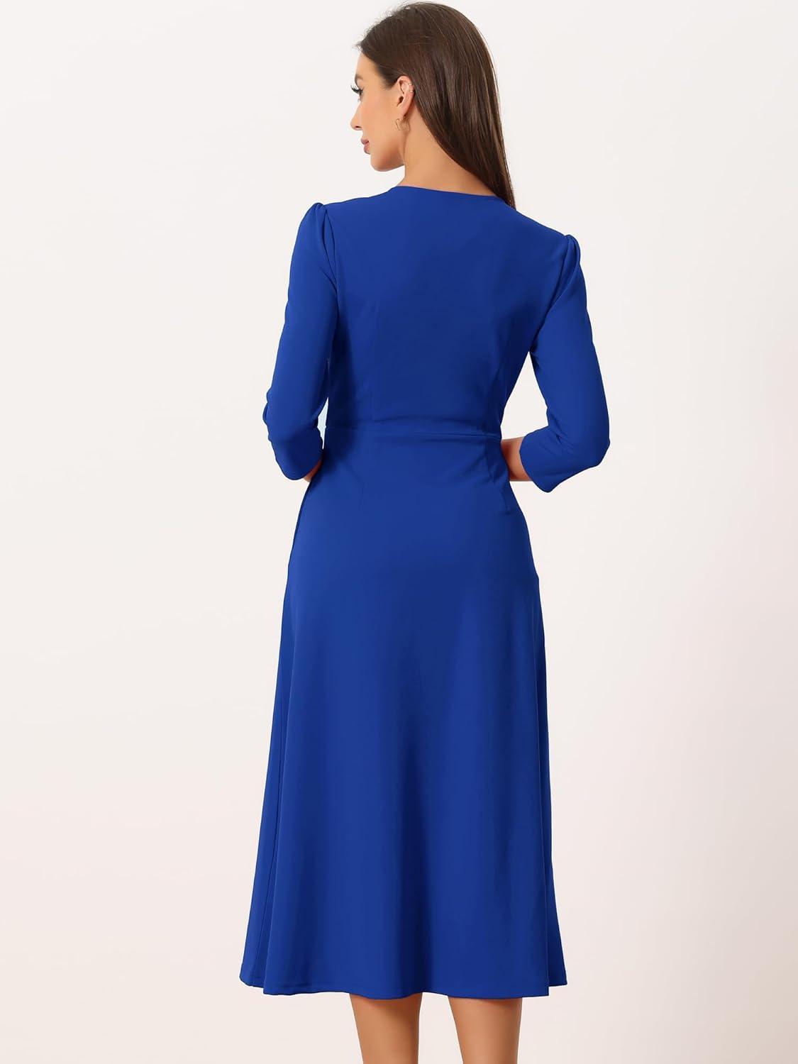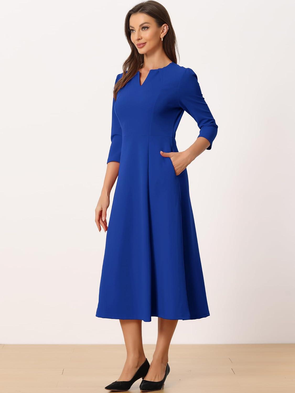 Allegra K Women’s 3/4 Sleeve Dresses V Neck Elegant A-Line Work Business Formal Midi Dress with Pockets(Royal Blue)