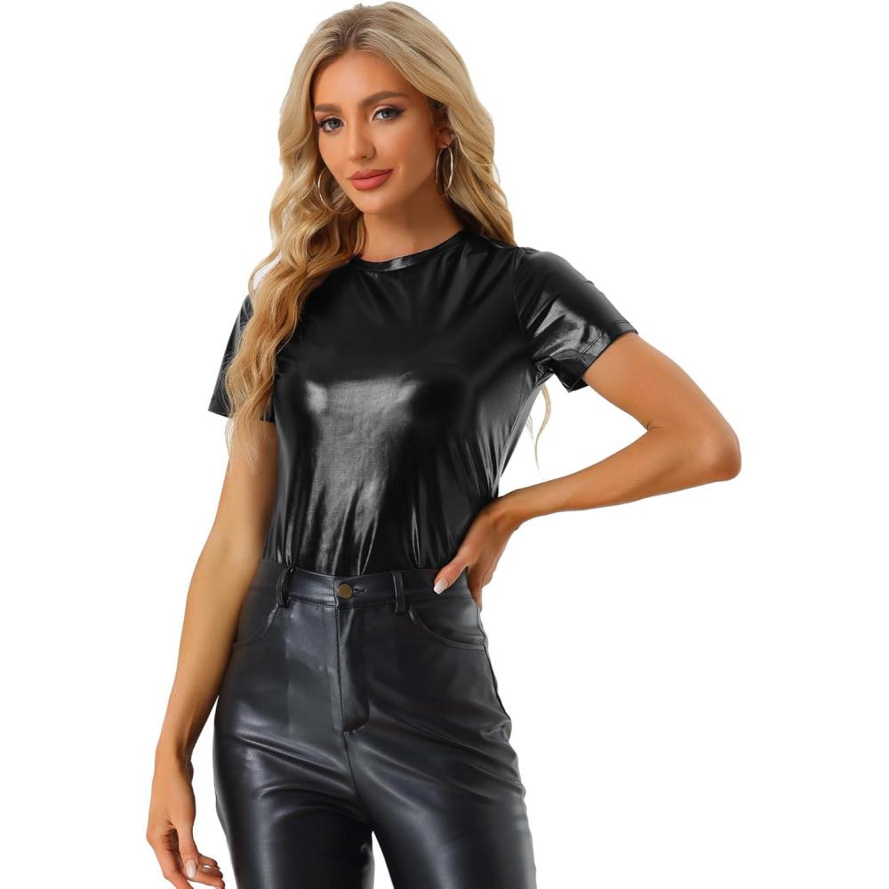 imageAllegra K Womens 80s Disco Outfit Party Club Sparkly Rainbow Metallic TopShiny Black