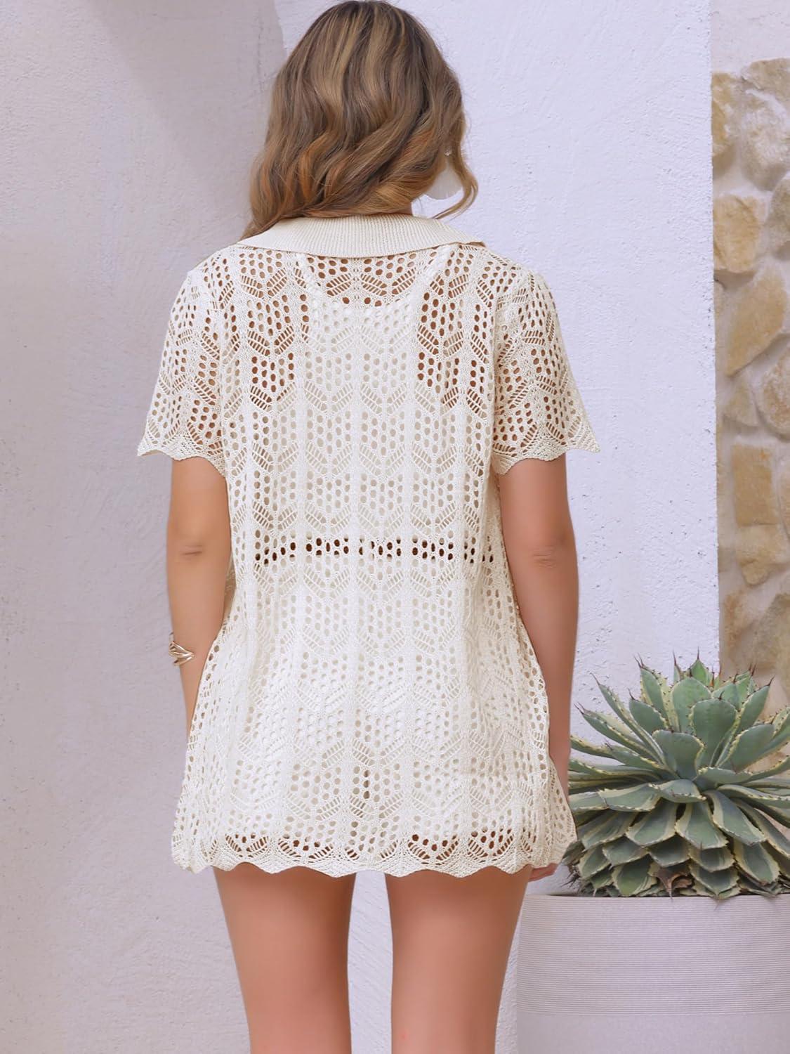 Allegra K Women’s Beach Cover Up Button Down Short Sleeve Crochet Hollow Out Summer Outfits(Apricot)