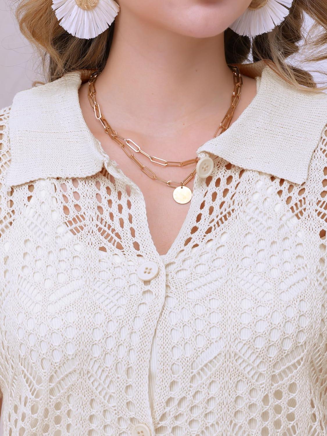 Allegra K Women’s Beach Cover Up Button Down Short Sleeve Crochet Hollow Out Summer Outfits(Khaki)