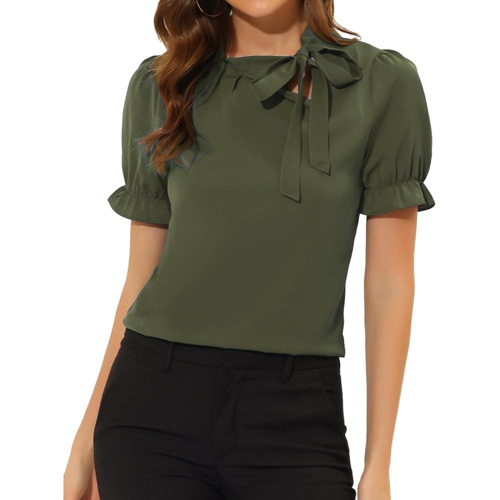 Allegra K Women’s Bow Tie Neck Tops Elegant Office Short Sleeve Blouse(Army Green)