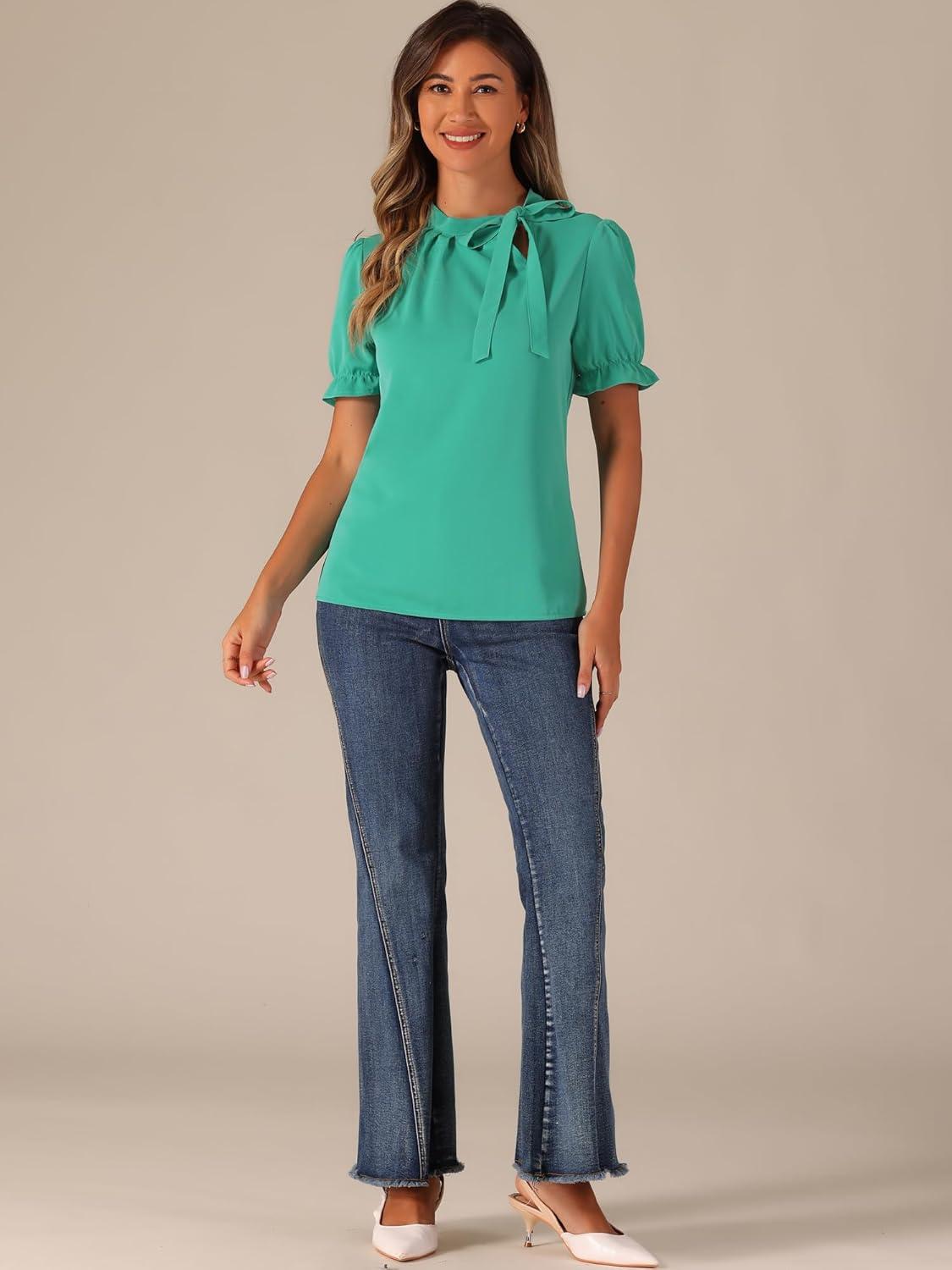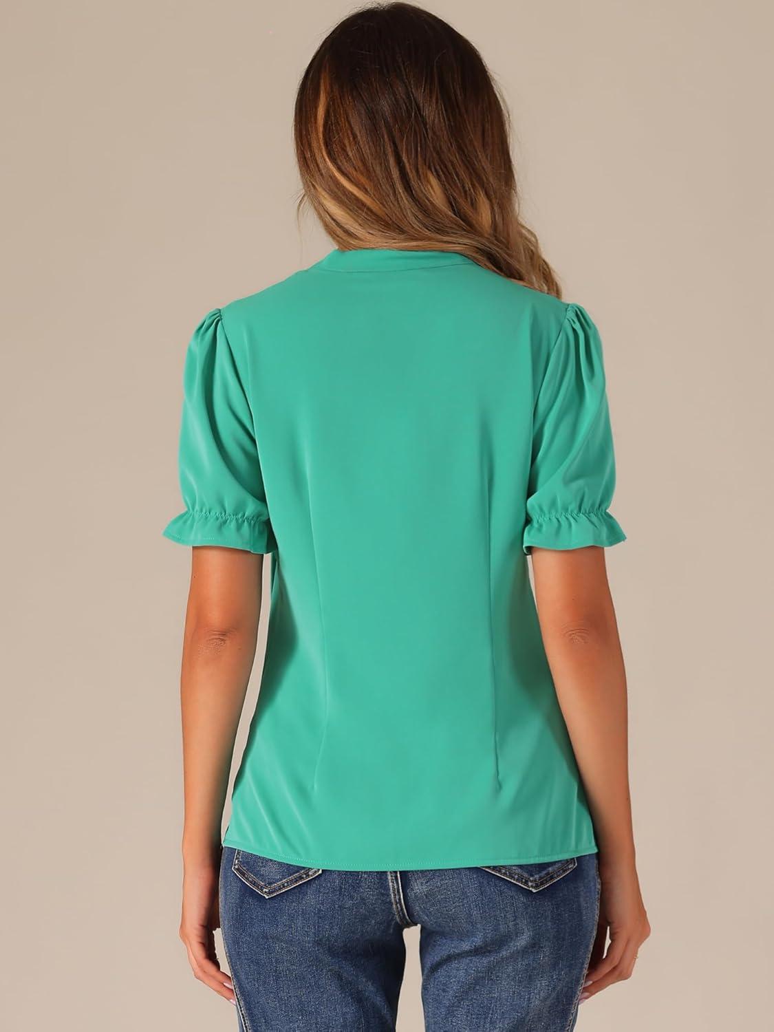 Allegra K Women’s Bow Tie Neck Tops Elegant Office Short Sleeve Blouse(Marrs Green)