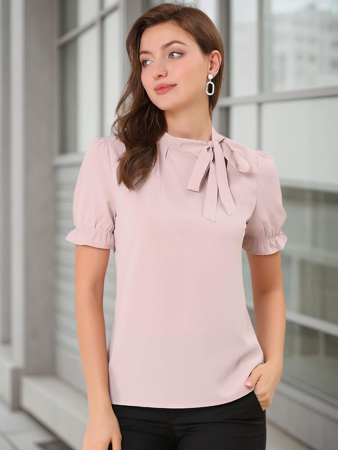 Allegra K Women’s Bow Tie Neck Tops Elegant Office Short Sleeve Blouse(Pink)