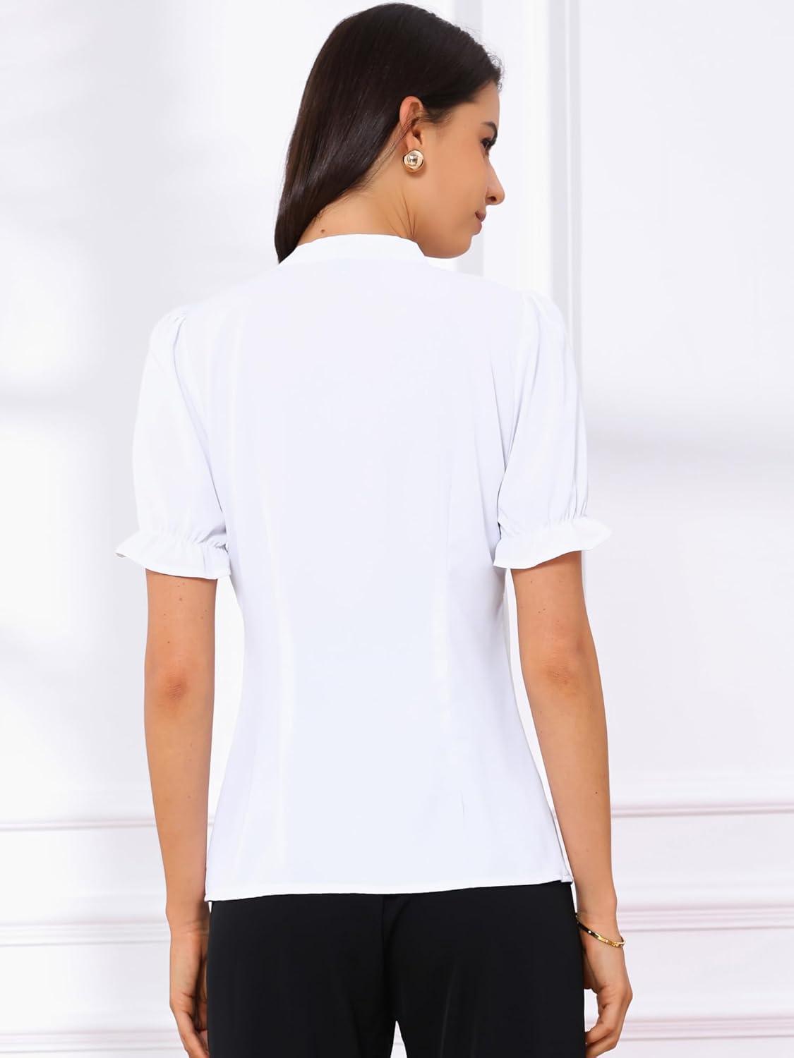 Allegra K Women’s Bow Tie Neck Tops Elegant Office Short Sleeve Blouse(White 1)