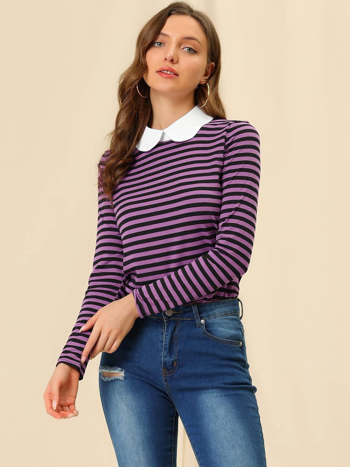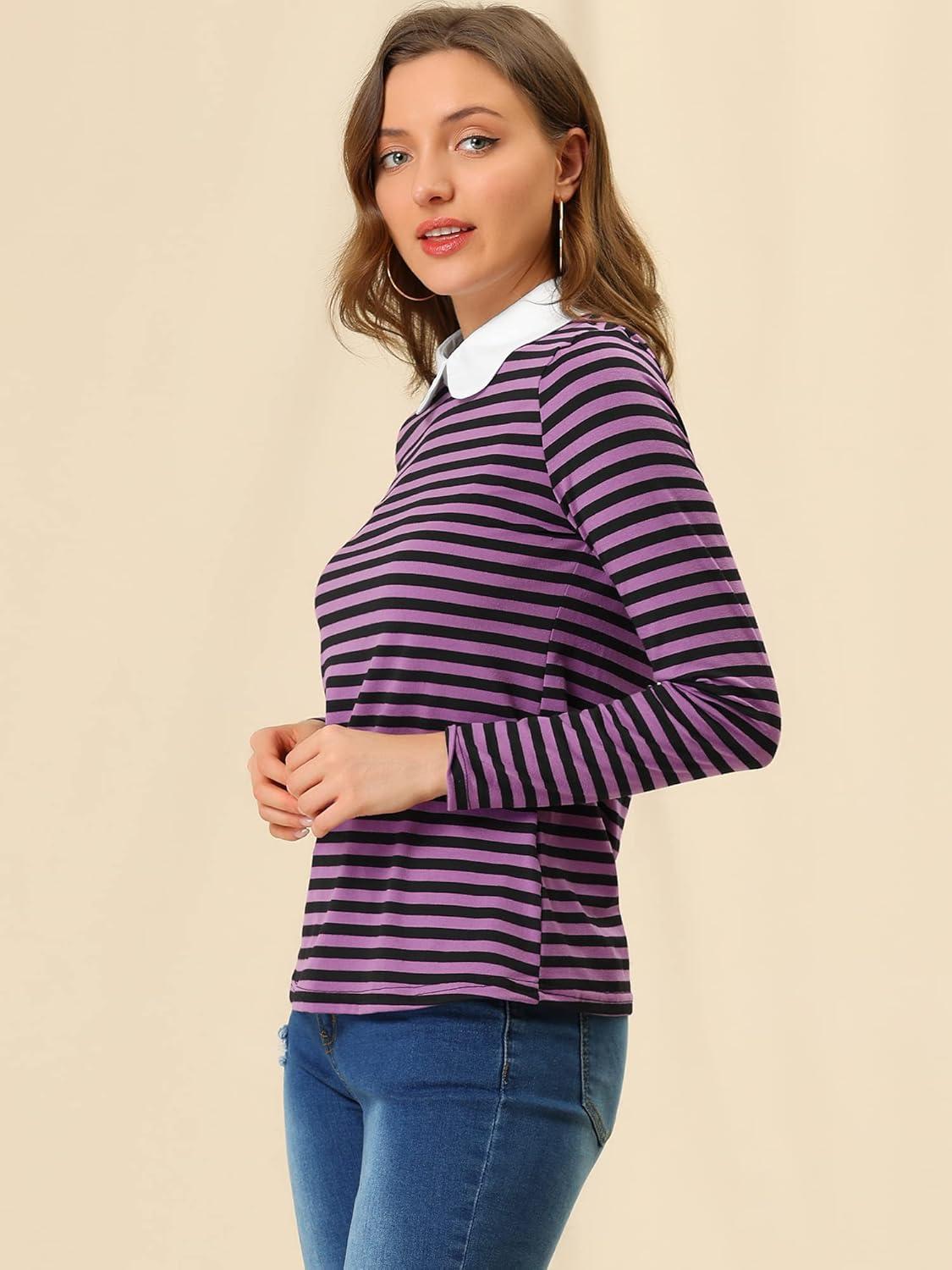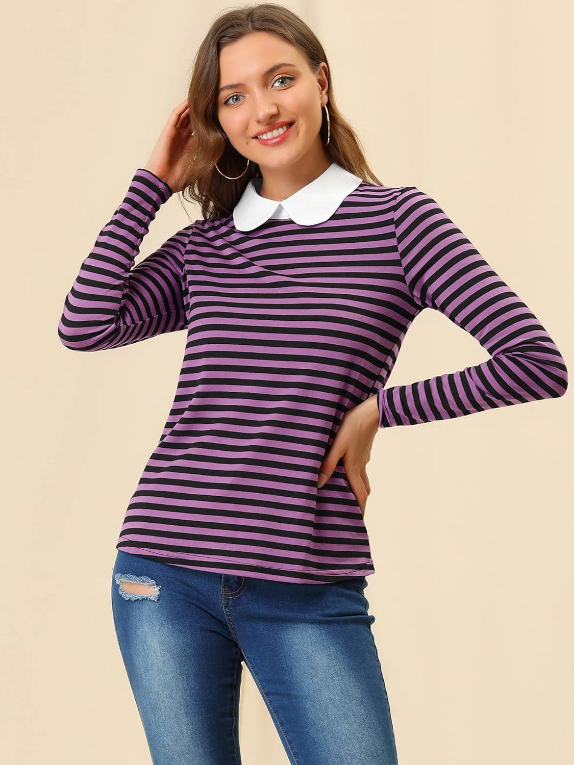 Allegra K Women’s Contrast Collar Long Sleeves Peter Pan Collar Striped Blouse Top(Purple Black)