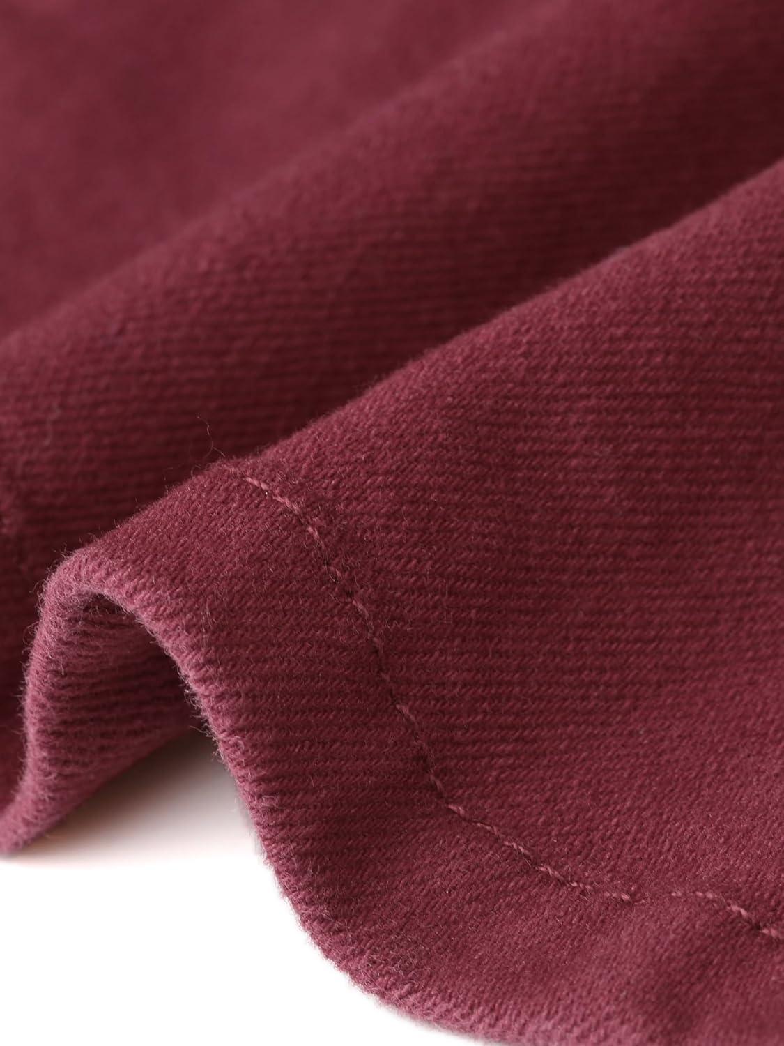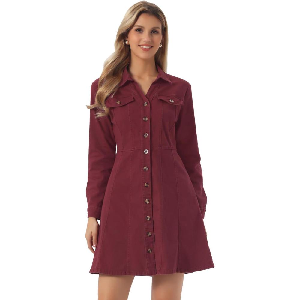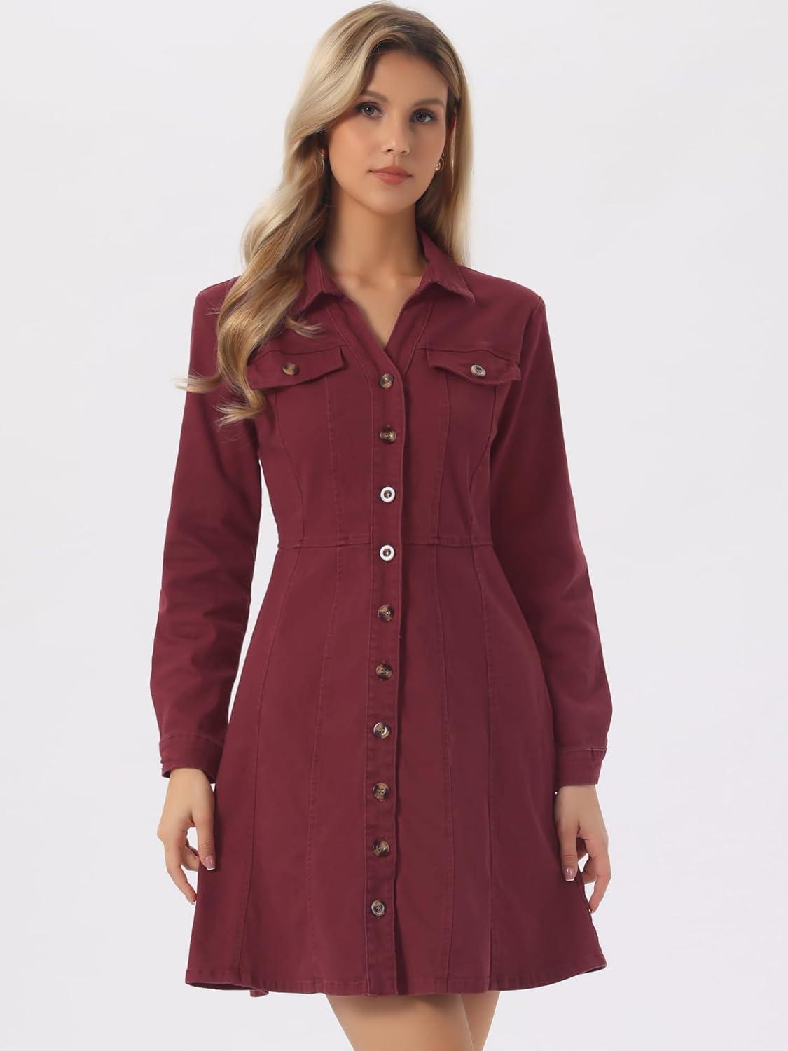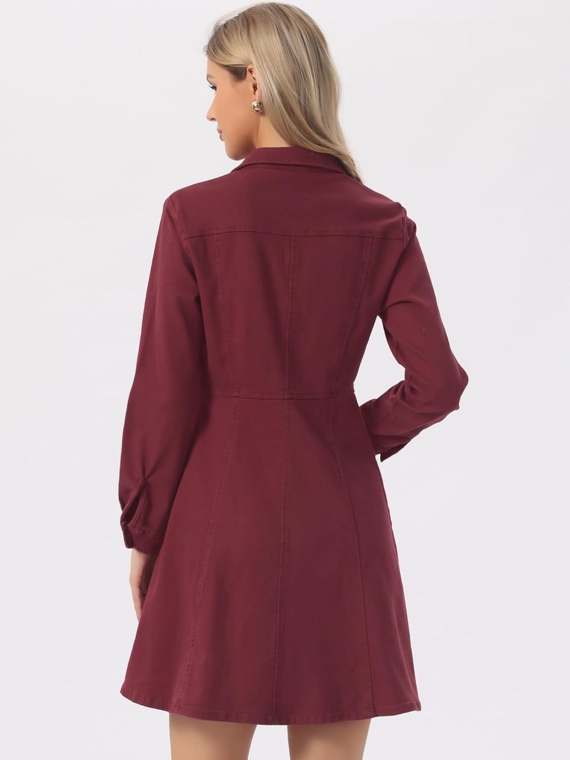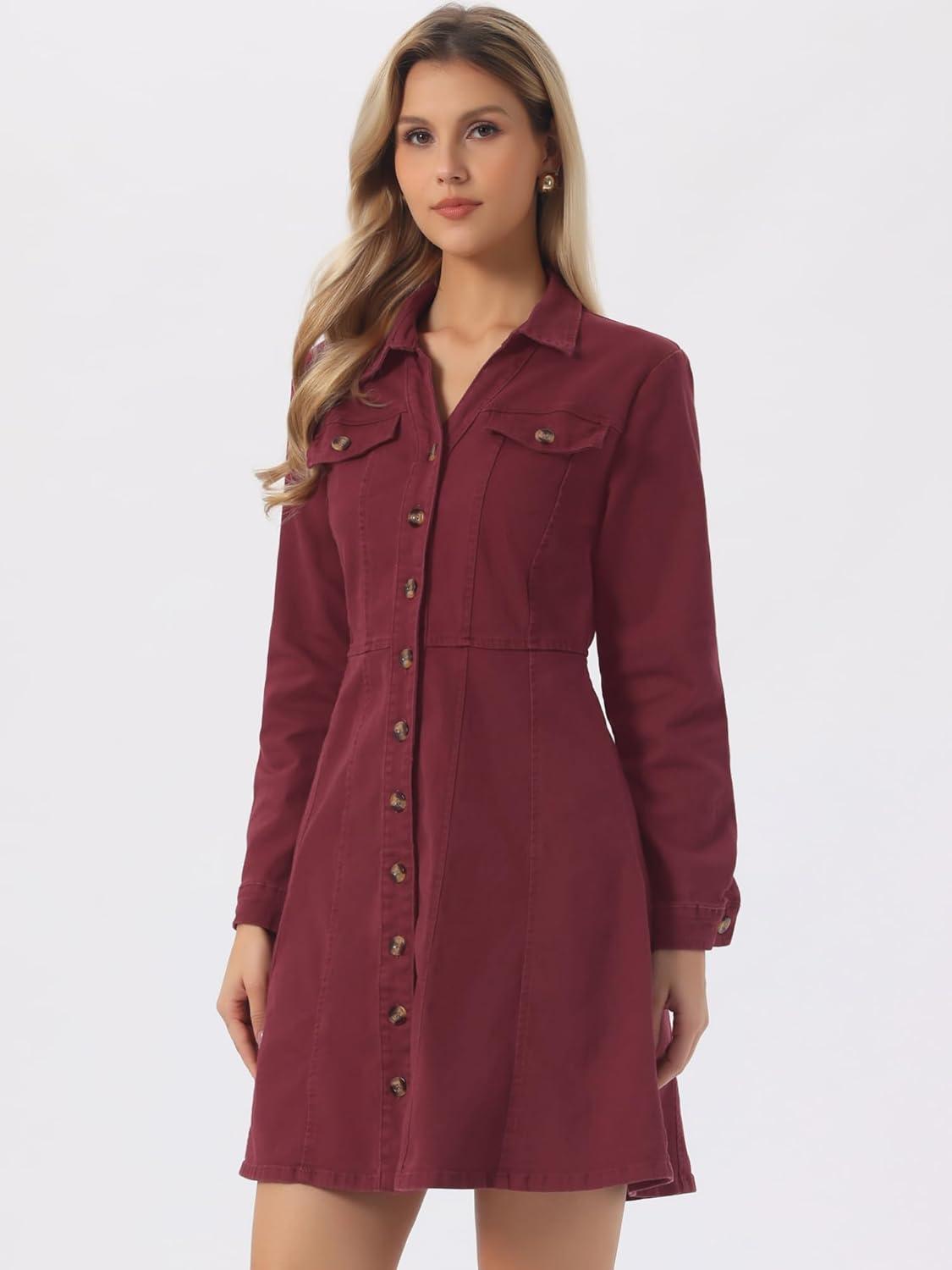 Allegra K Women’s Denim Dress Button Down Collar V Neck Long Sleeve A-line Cotton Jean Dress(Wine Red)