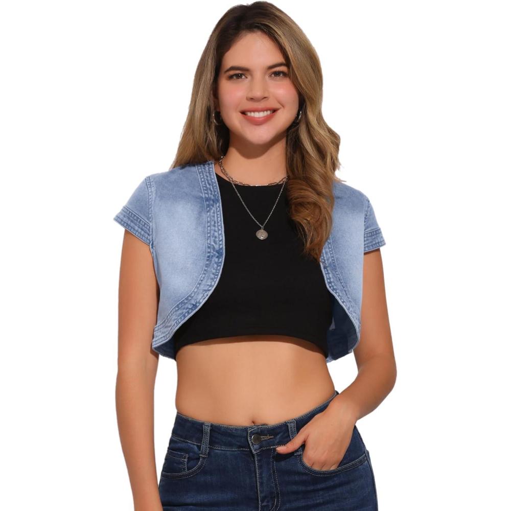 Allegra K Women’s Denim Jacket Crop Casual Denim Cardigan Cap Sleeve Summer Outfits Jean Jacket Shrug(Light Blue)