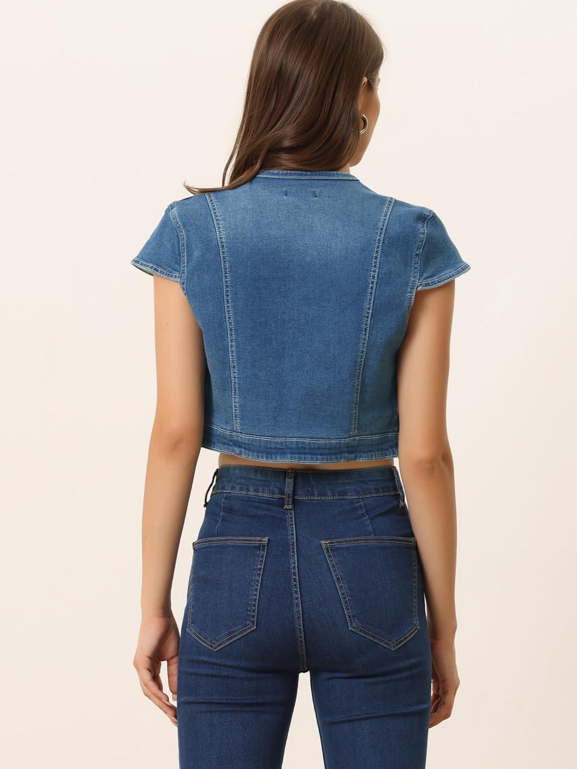 Allegra K Women’s Denim Jacket Short Sleeve Jean Jacket Slim Fit Summer Outfits Casual Cropped Jacket(Medium Blue)