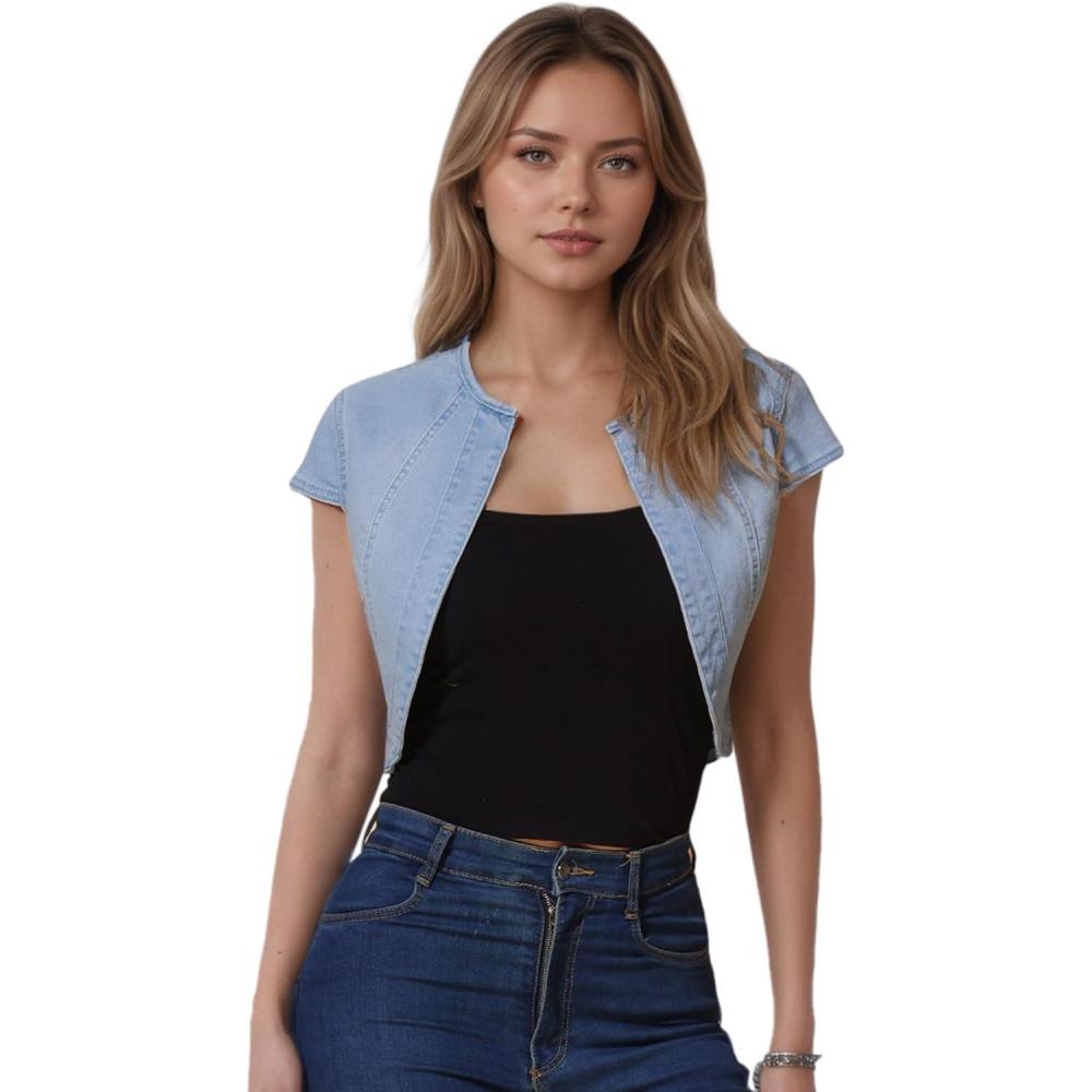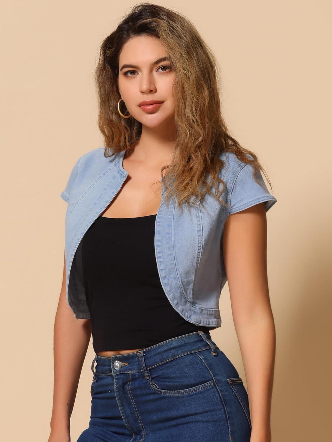 Allegra K Women’s Denim Jacket Short Sleeve Jean Jacket Slim Fit Summer Outfits Casual Cropped Jacket(Medium Blue)