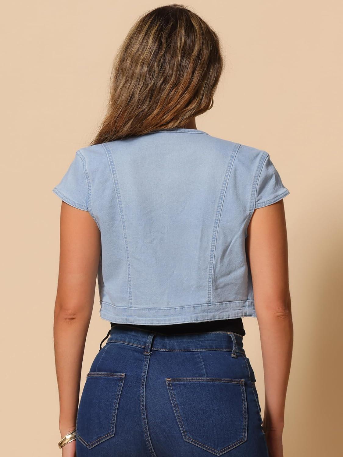 Allegra K Women’s Denim Jacket Short Sleeve Jean Jacket Slim Fit Summer Outfits Casual Cropped Jacket(Sky Blue)
