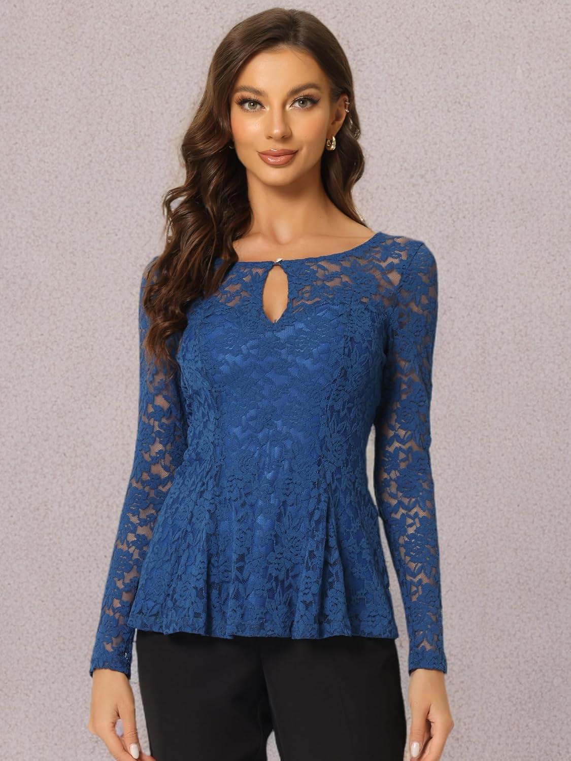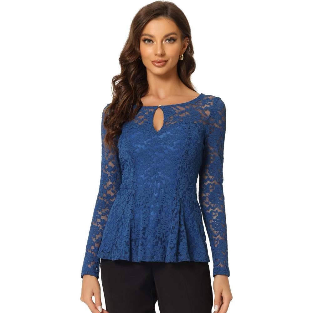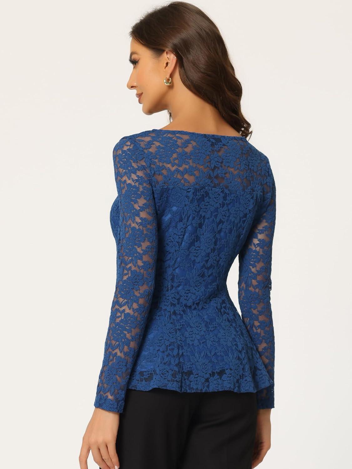 Allegra K Women’s Dressy Top Formal Wedding Guest Long Sleeve Lace Peplum Blouse(Royal Blue)