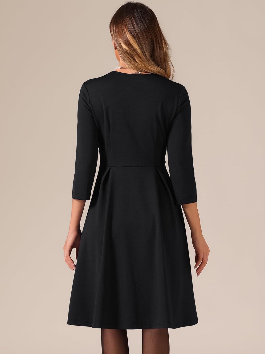 Allegra K Women's Elegant 3/4 Sleeve High Waist Sweetheart Neck A-Line Pleated Midi Dress(Black)