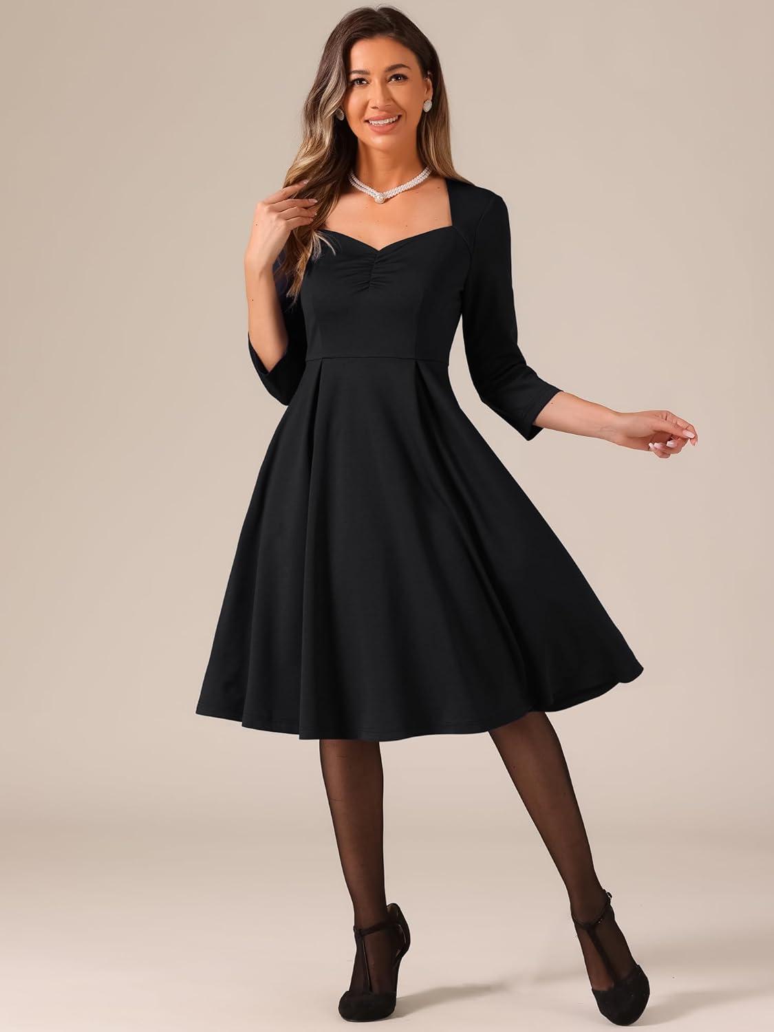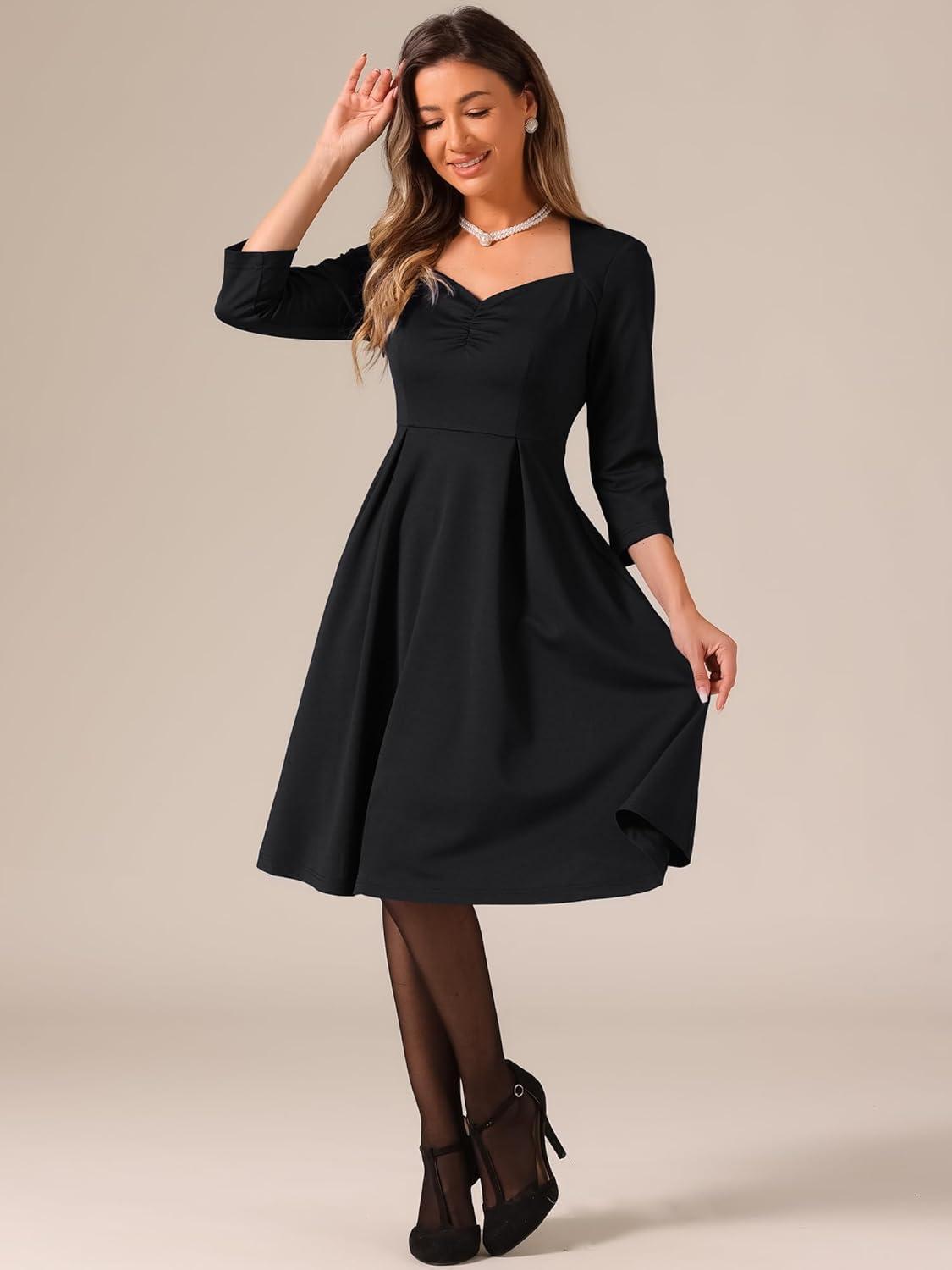 Allegra K Women’s Elegant 3/4 Sleeve High Waist Sweetheart Neck A-Line Pleated Midi Dress(Black)