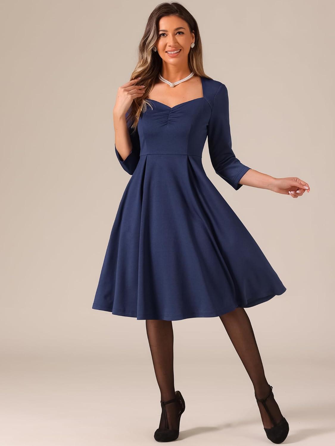 Allegra K Women’s Elegant 3/4 Sleeve High Waist Sweetheart Neck A-Line Pleated Midi Dress(Dark Blue)