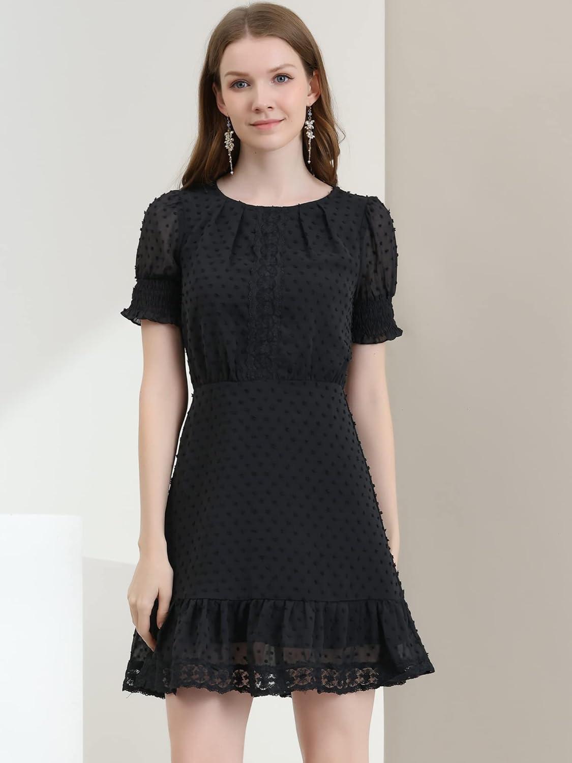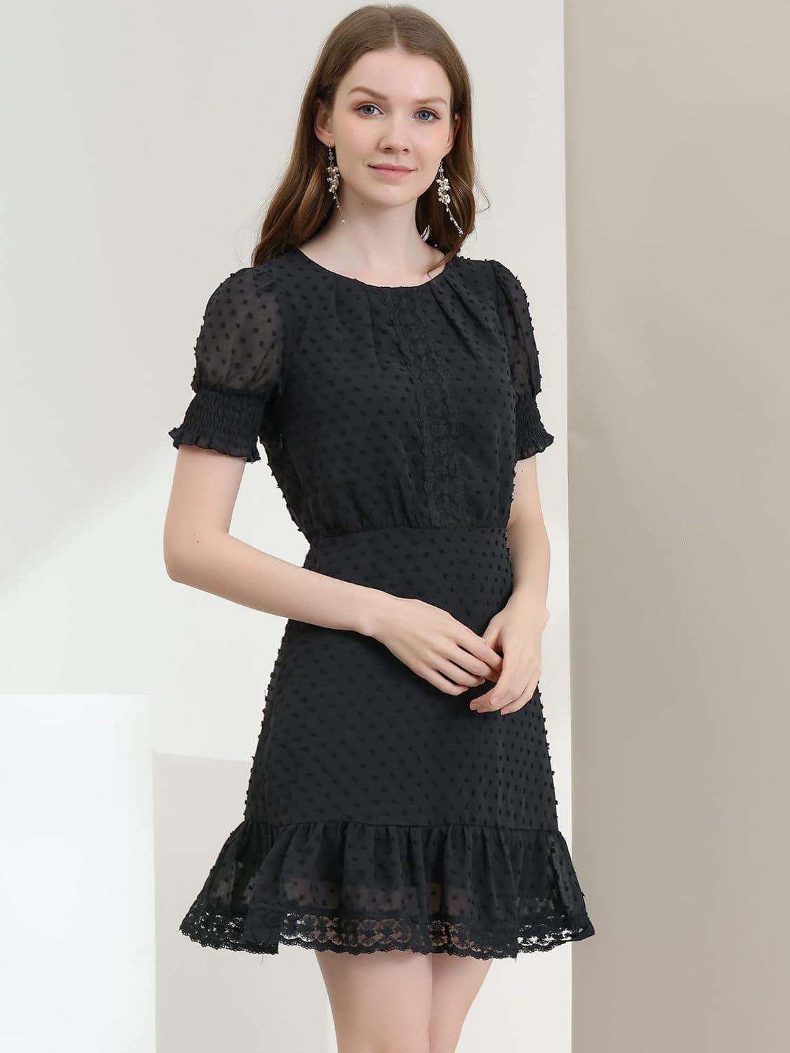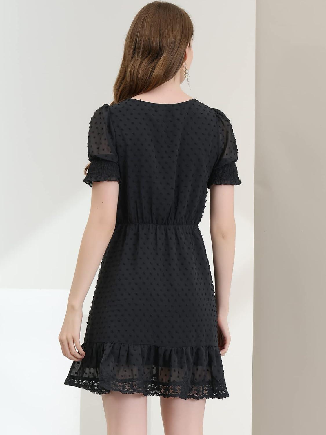Allegra K Women’s Elegant Short Sheer Sleeve Ruffle Hem Swiss Dots Chiffon Dress(Black)
