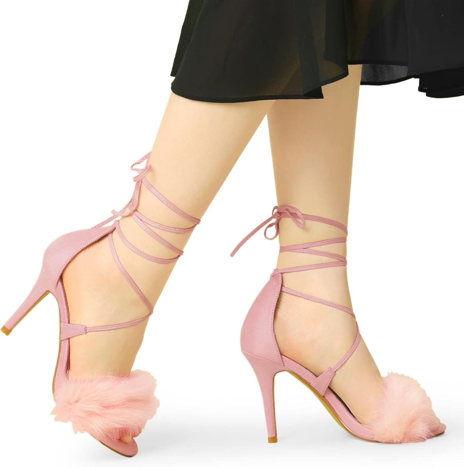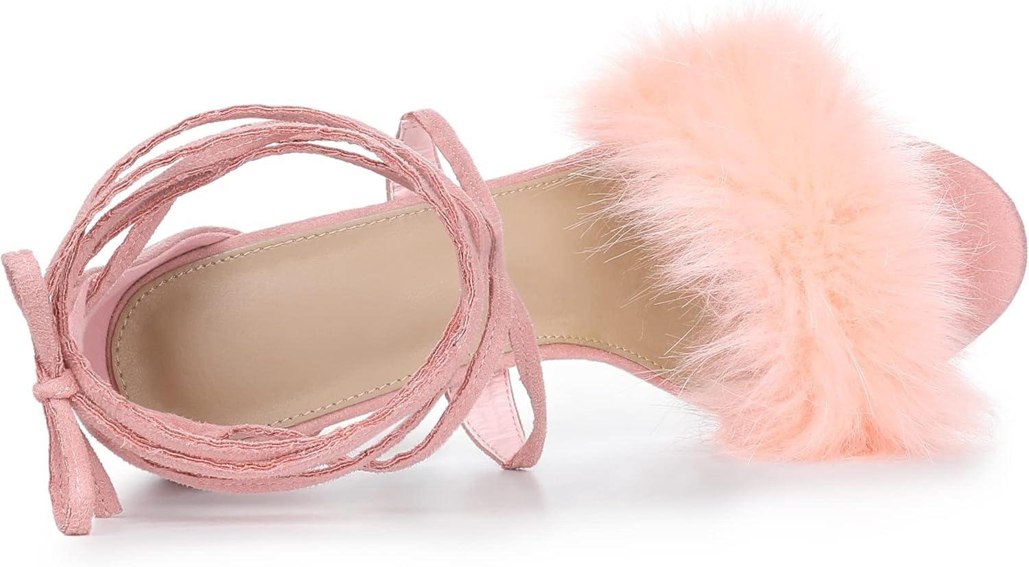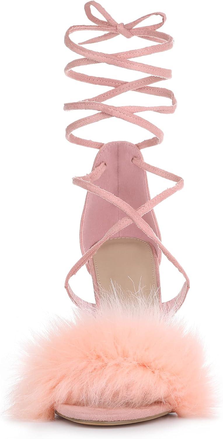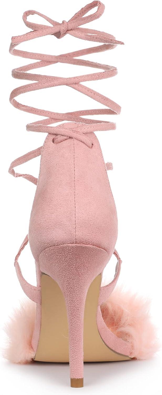 Allegra K Women’s Faux Fur Stiletto Heel Lace Up Heels Sandals(Pink)
