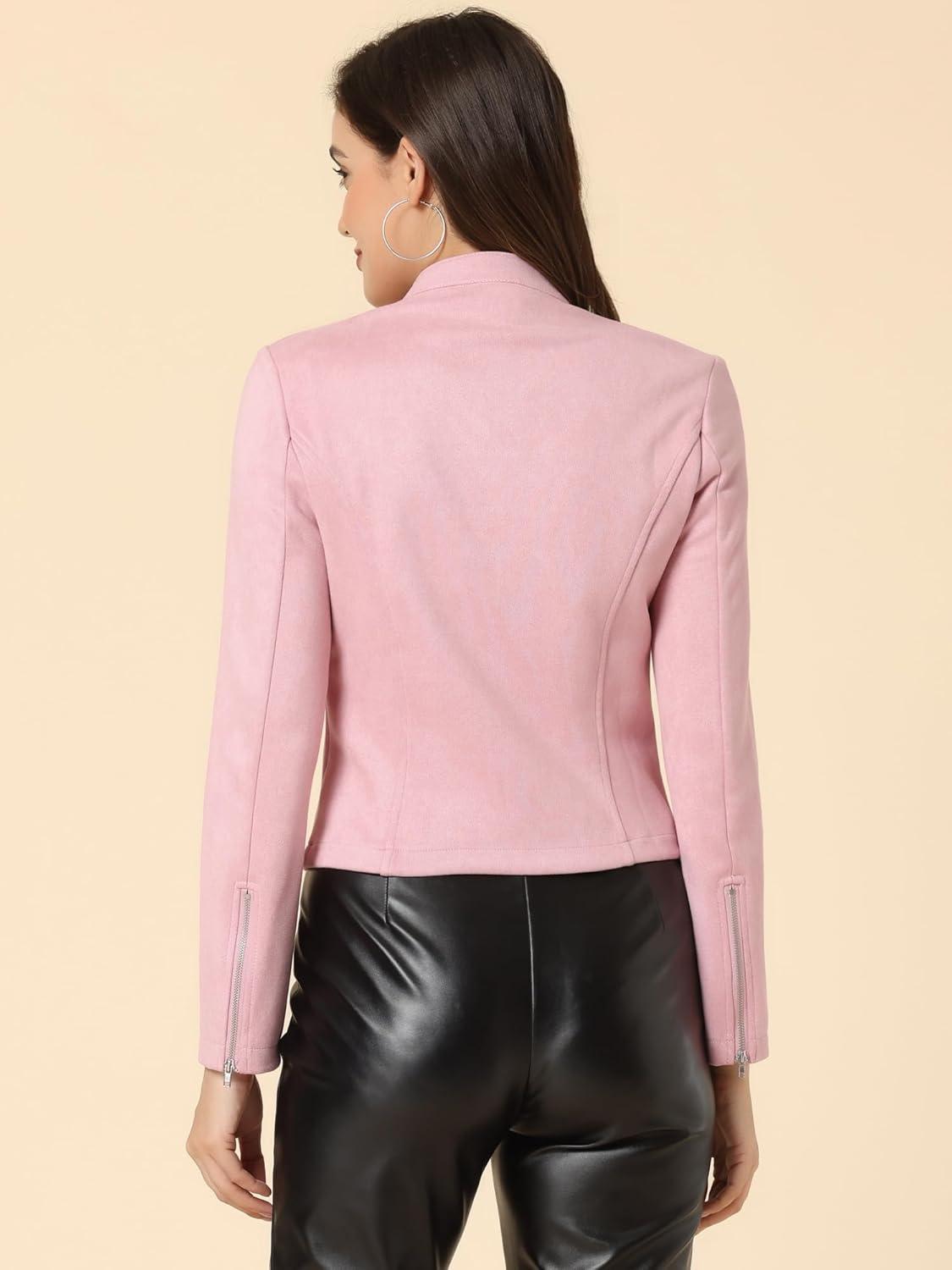 Allegra K Women’s Faux Suede Jacket Stand Collar Zip Up Long Sleeve Motorcycle Biker Coat(Pink)